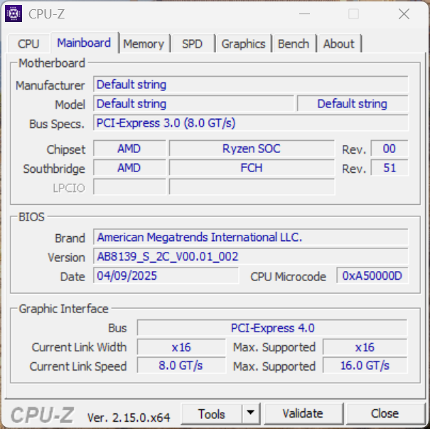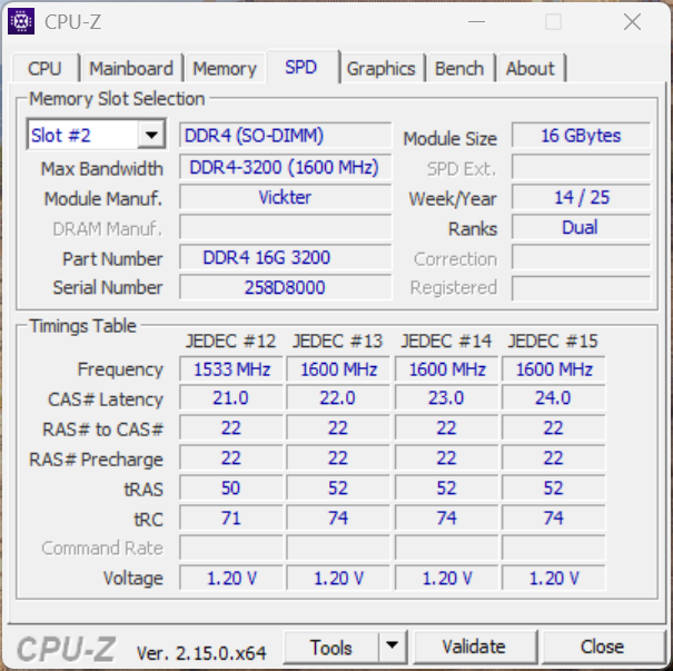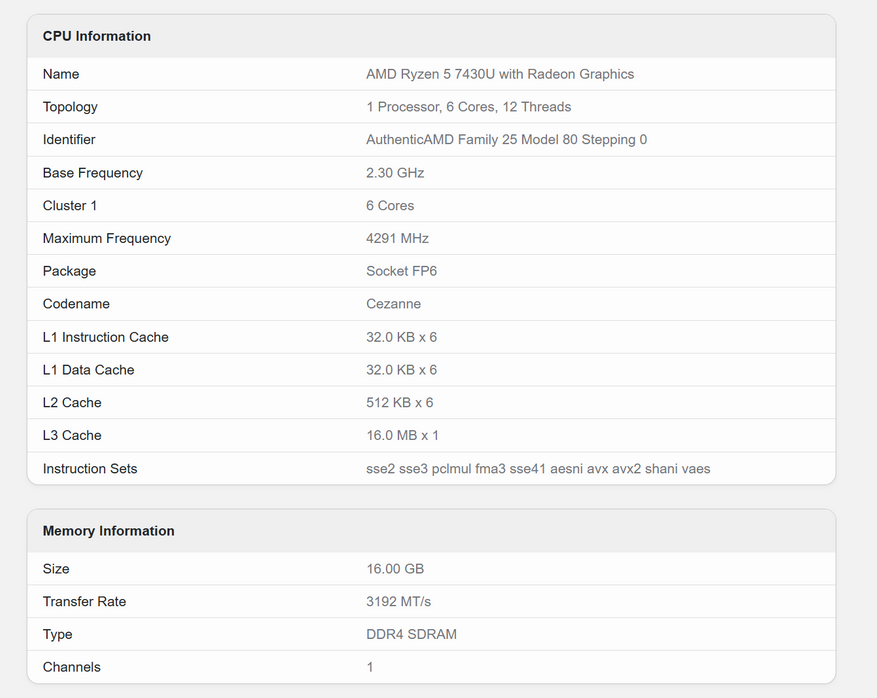 Популярный бенчмарк CPU-Z подтвердил заявленное железо: процессор AMD Ryzen 5 7430U, 16GB ОЗУ DDR4-3200 на 1600 MHz формата SO-DIMM и встроенная графика AMD.