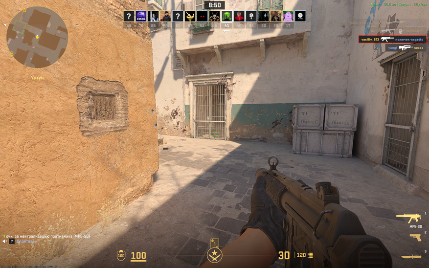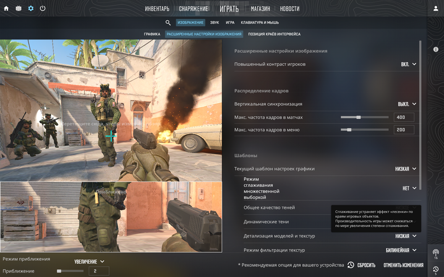 Для интереса попробуем запустить популярный онлайн шутер Counter Strike 2. Выставляем разрешение 1920*1200 и низкие параметры графики. Играется на уровне 28-30 FPS.