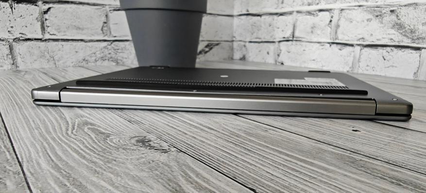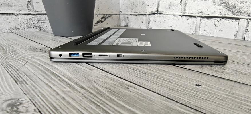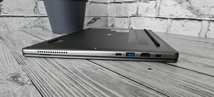 На левом торце разместили два Type-C интерфейса с поддержкой зарядки через Power Delivery и передачи данных до 10Гбит/сек, HDMI 2.1 и USB 3.2 Gen 2 Type-A порт. На правом торце разъем наушников 3.5мм, USB 3.2 Gen 2 Type-A, USB 2.0, картридер microSD и замок Кенсингтона. Также справа и слева симметрично расположены отверстия динамиков. Разъемов тут предостаточно, и, как дань моде, отсутствует Ethernet разъем проводного интернета, что нивелировано скоростным стандартом Wi-Fi подключения.