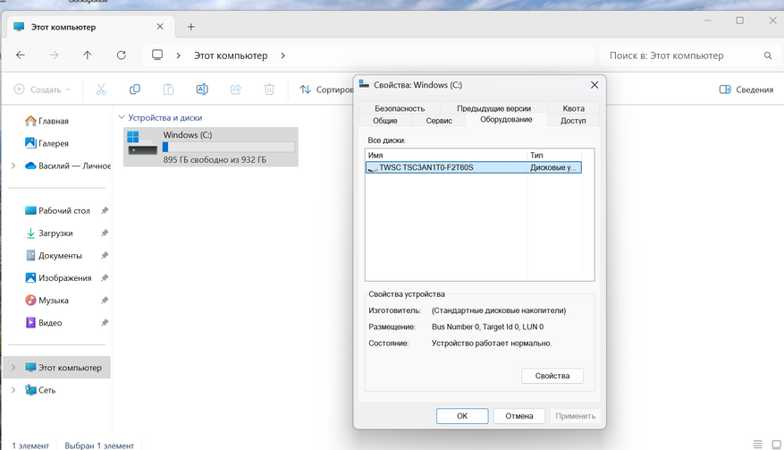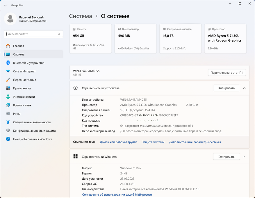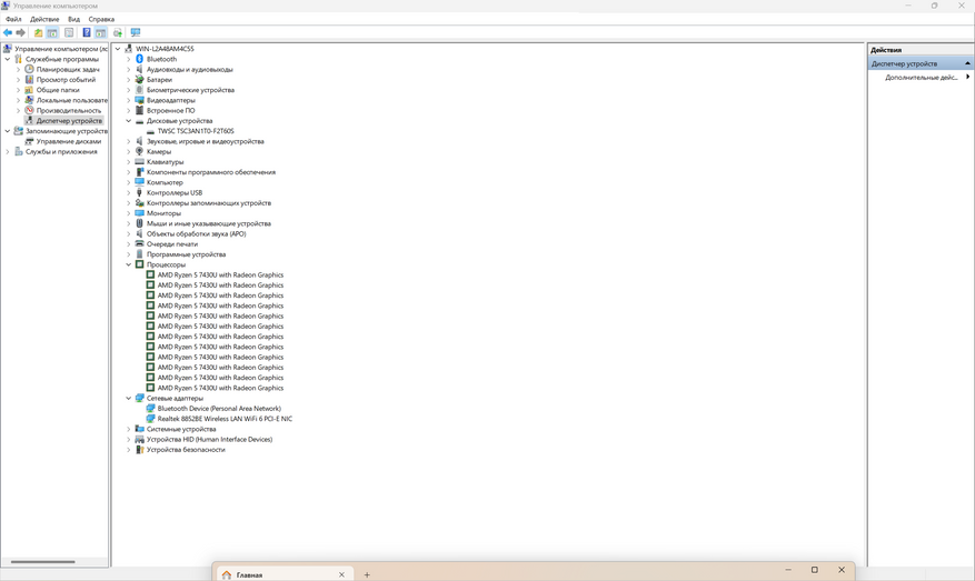 Ноутбук работает на операционной системе Windows 11 pro. Изначально системой занято 37ГБ из жесткого диска на 1ТБ. За производительность отвечает AMD Ryzen 5 7430U. В диспетчере устройств все устройства имеют последние версии драйверов, никаких треугольников нет. Все железо обновляется через стандартную службу обновления Windows.
