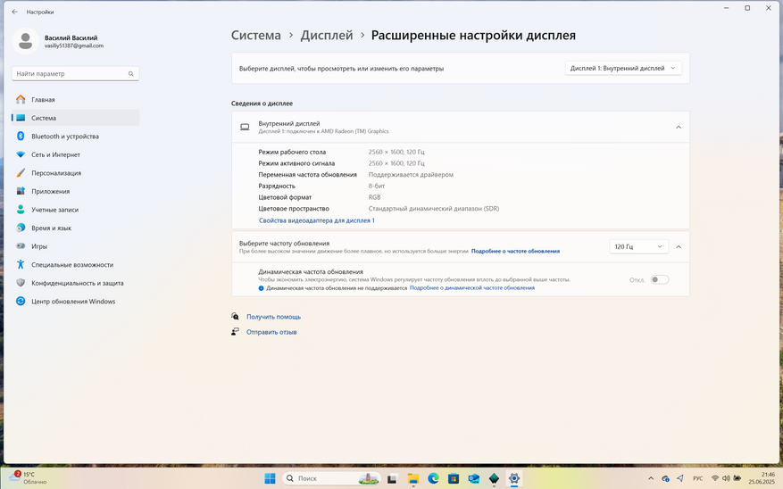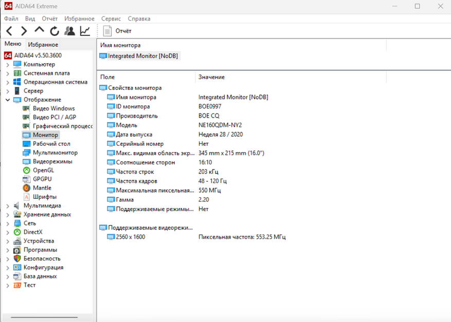 Судя по данным AIDA64 в ноутбуке использована матрица BOE NE160QDM-NY2, довольно качественная матрица с достойным охватом, высоким разрешением 2560*1600 и частотой 120 Гц.