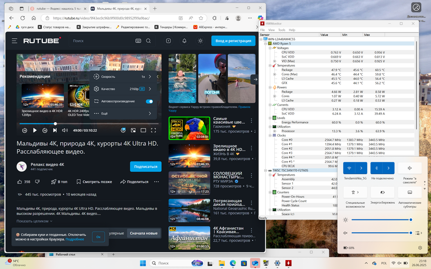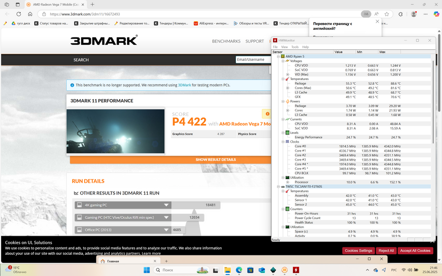 Cinebench v23 выдал 6670 очков в мультитесте и 1368 при Single test, поставив этот процессор над Intel Core i7-7700K. 3Dmark выдал 4442 балла, что говорит о слабой игровой производительности.