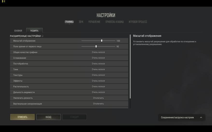 В чемпионате PUBG: Battlegrounds выставляем разрешение 1920*1080 и очень низкие параметры графики. Тогда частота кадров будет на уровне 20FPS. Нужно еще чуть уменьшать разрешение.