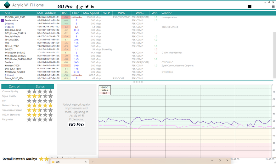 При том, что у ноутбука есть поддержка Wi-Fi 6 поколения и довольно качественный прием сети с него вполне свободно можно просматривать контент 4К онлайн. Скорости интернета в 5ГГц диапазоне достигают 250 Мбит/сек, согласно тесту от Ookla. Скорость соединения достигает 866 Мбит/сек и имеет вполне стабильный прием согласно тесту Аcrylic Wi-Fi home.
