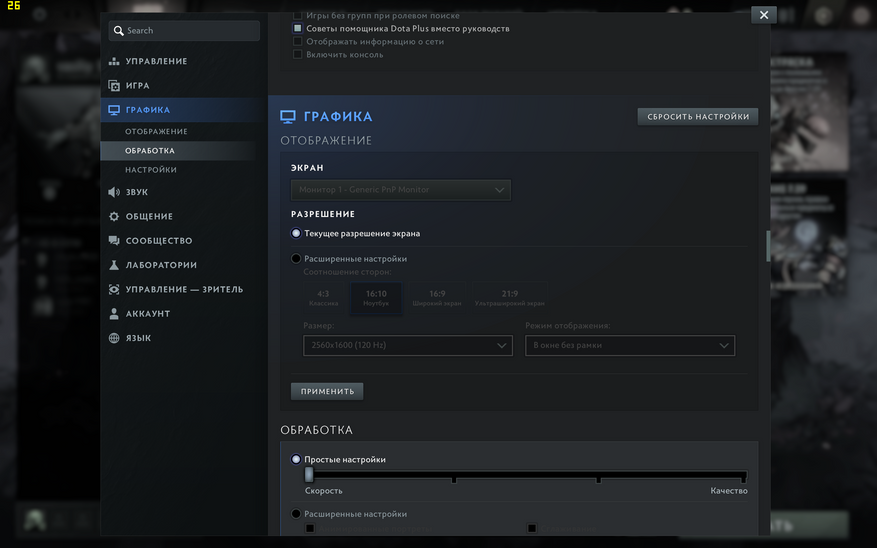 Dota 2 играется на разрешении 2560*1600 и низкой графике с FPS около 50.