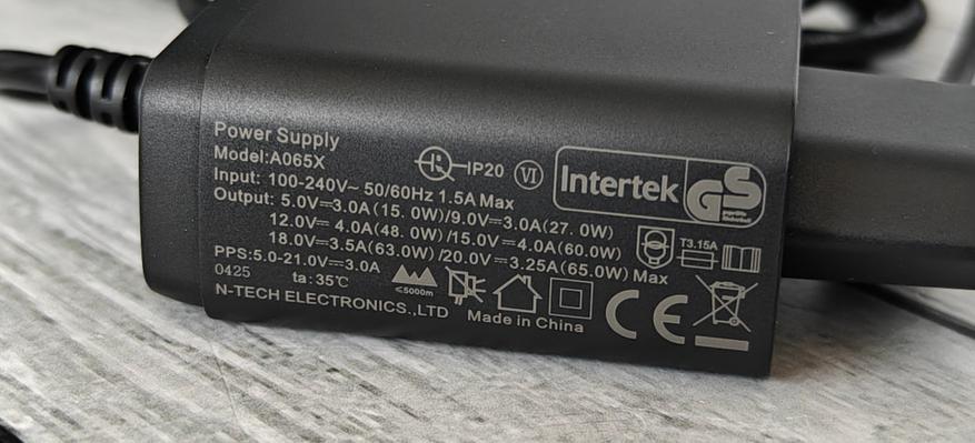 Блок питания с несъемным кабелем с разъемом Type-С. Мощность блока питания 65Вт с поддержкой PD. Кабель длиной 1.3 метра.