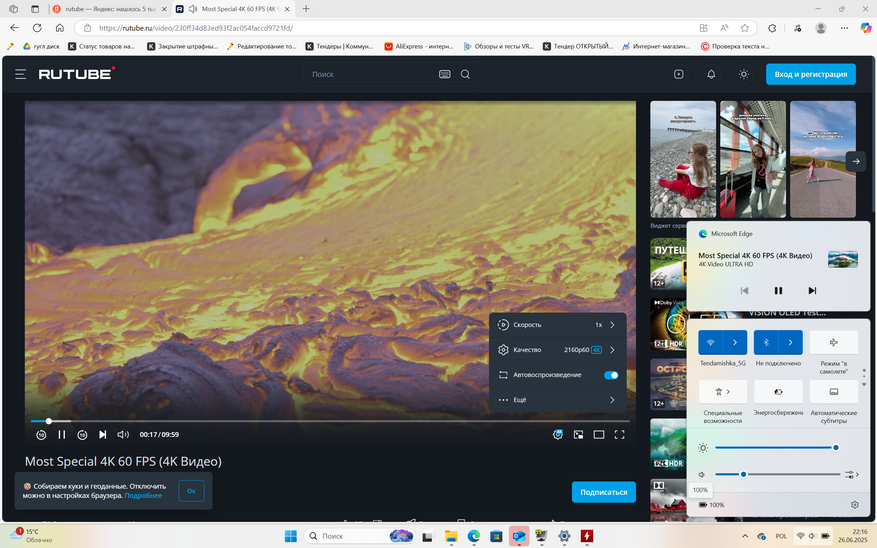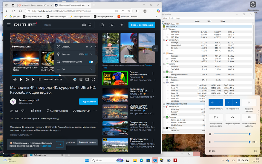 Для понимания возможностей работы от аккумулятора запустим классический тест воспроизведения 1080 видео на полной яркости и громкости 50 процентов. За час тратится 27 процентов батареи. Если просматривать видео 4К, то за час потратится 32 процента батареи. В режиме просто офисной работы аккумулятора хватает примерно на 5-6 часов.