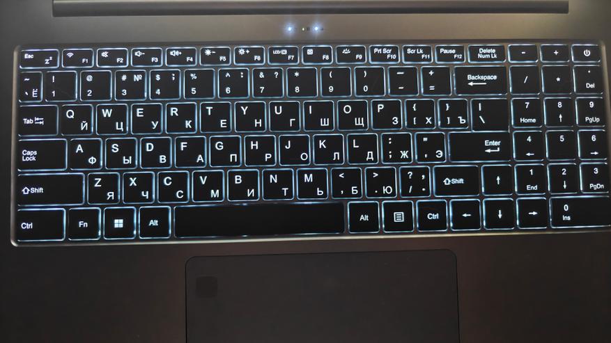 Подсветка клавиатуры регулируется на два шага или может быть просто отключена. Индикаторы CapsLock и NumLock такого же белого цвета. Ноутбук умеет заряжаться с мощностью 65Вт от PD зарядника через любой Type-C порт. Процесс зарядки сопровождается индикацией красного цвета рядом с разъемом. Также через любой порт Type-C можно выводить видео на внешний монитор — телевизор.