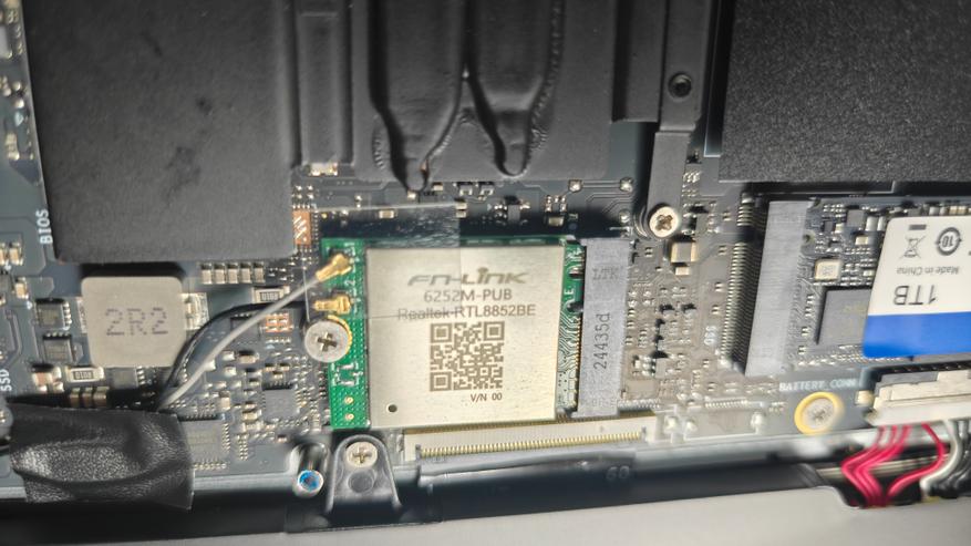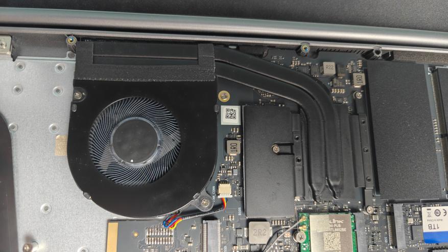 Кулер выводит теплый воздух от процессора на задний торец с вентиляционными прорезями, которые так не видны. За скорость интернета отвечает адаптер Realtek RTL8852BE с поддержкой сетей 6-го поколения.