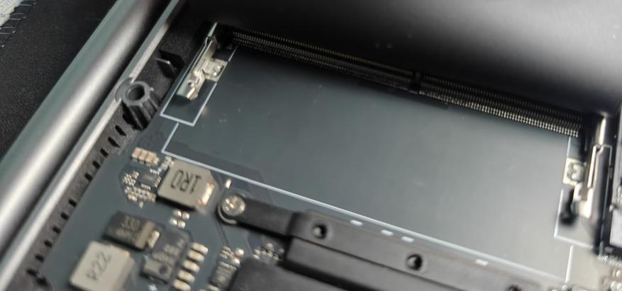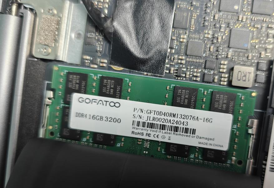 На плате два слота оперативной памяти формата SO-DIMM, один занят планкой DDR4 на 16GB от компании Gofatoo. Отметим, что для апгрейда понадобится купить еще одну планку на 16ГБ и это будет более выгодно, чем если бы производитель поставил две планки по 8ГБ.