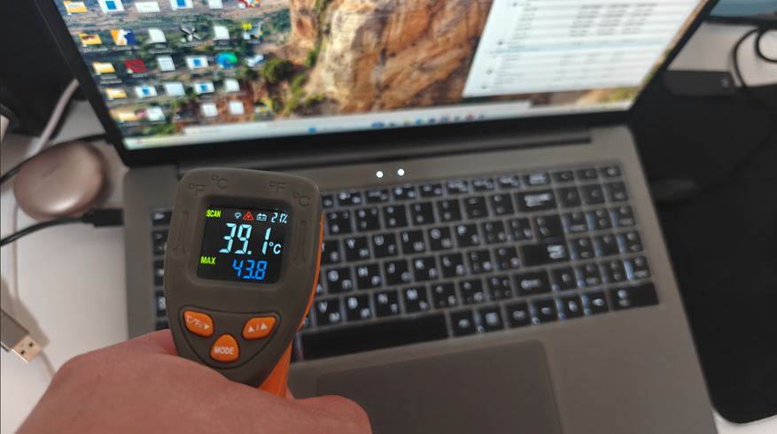 За время игр процессор нагревался максимум до 96,9 С, в среднем держась на уровне 75-80 С. А корпус сверху не разогрелся выше 43,8 С, в области WASD температура во время игр составила 39,1 С. Перегрева нет, просто по ощущениям чуть теплый корпус. Даже на самых больших нагрузках вентилятора почти не слышно.