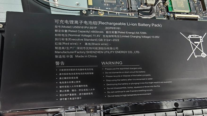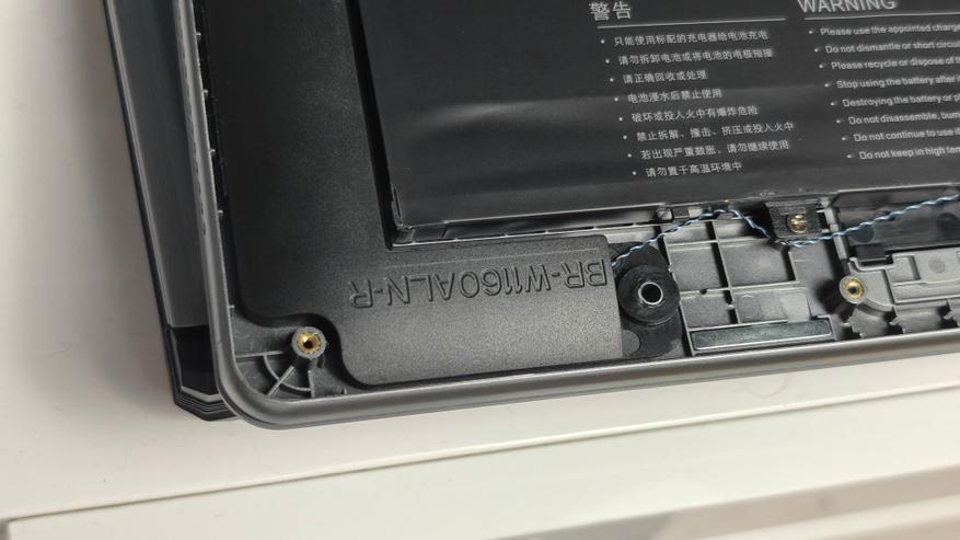 Остается посмотреть, как реализована система охлаждения внутри ноутбука, и есть ли какие-нибудь возможности легкого апгрейда. Чтобы добраться до материнской платы устройства откручиваем винты сзади. Один под специальной гарантийной пломбой. Внутри довольно логично расположены компоненты. Процессор (находится по центру) охлаждается одним кулером с регулировкой оборотов. Работает ноутбук от аккумулятора на 4800мАч 54,72Вт/ч.