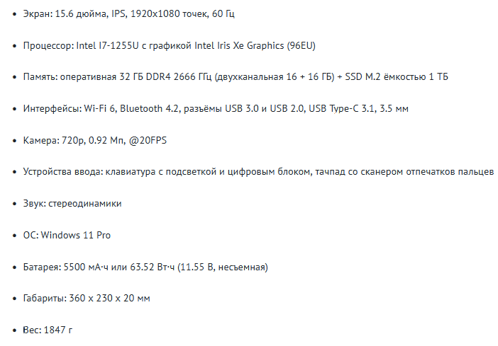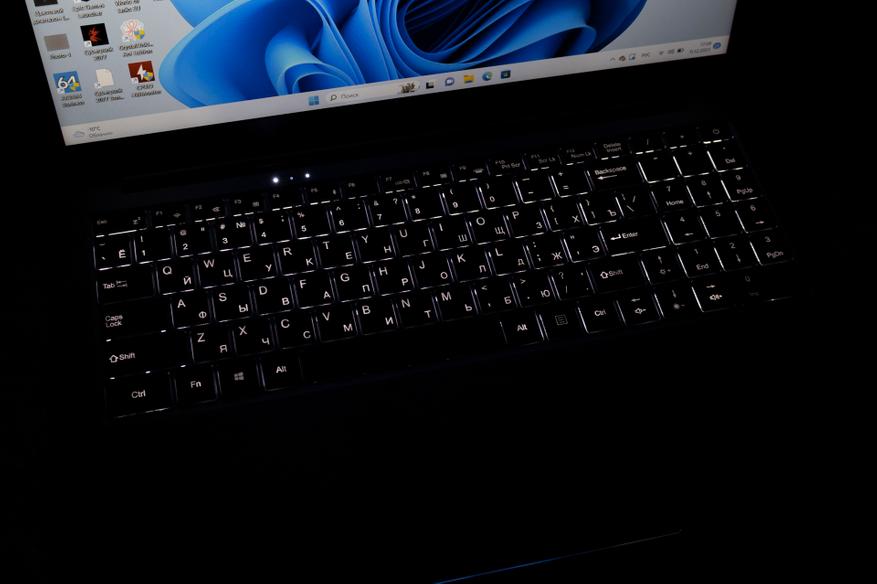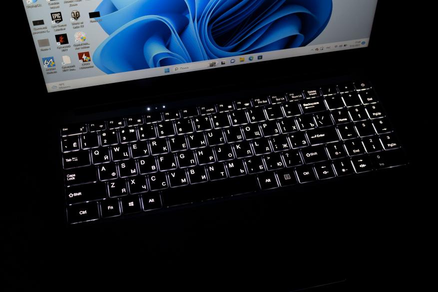 Ноутбук имеет полноразмерную клавиатуру с двухуровневой подсветкой, дисплей с диагональю 15.6 дюйма, предустановленный Windows 11 Pro и сканер отпечатков пальцев. С охлаждением всё хорошо, как и с качеством сборки металлического корпуса. Недостатки тоже имеются, ну, а насколько они критичные, решать вам. К примеру, разъём USB Type-C 3.1 годится только для передачи данных, а у дисплея узкий цветовой охват, что на самом не редкость для ноутбуков.