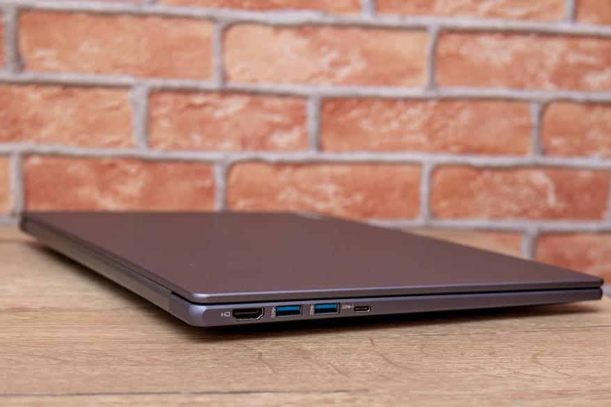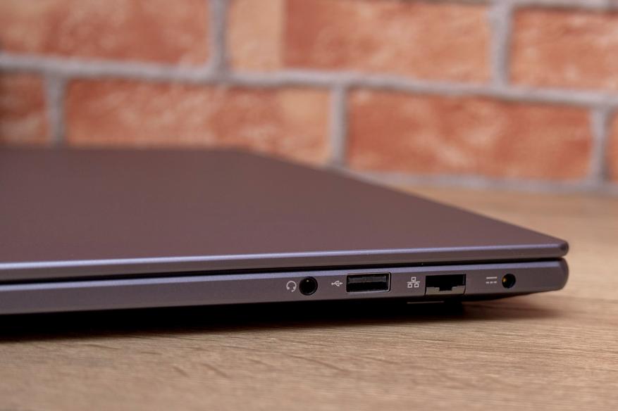 С боковыми портами всё предсказуемо — USB-A в ноутбуке три штуки, два из которых версии 3.0, а ещё один версии 2.0. Помимо них — разъём 3.5 мм для проводных наушников, разъём для зарядки, LAN (1000 Мбит/с), HDMI v1.4 и USB-C (USB 3.1). Последний весьма ограничен по функциям и умеет только передавать данные. Не помешал бы встроенный SD-ридер — внешний вариант при необходимости придётся подключать к USB-портам.
