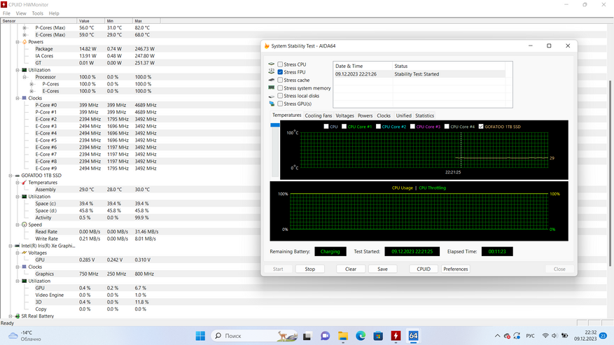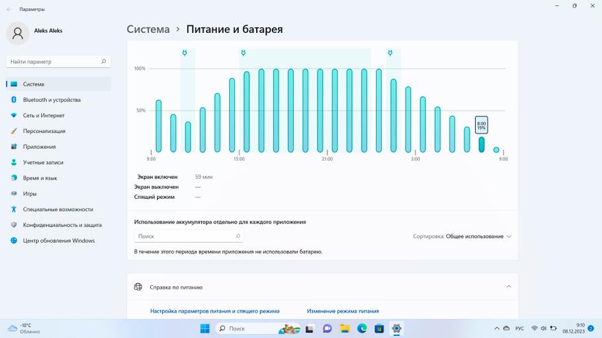 Скорость зарядки оставляет желать лучшего — от 0 до 100% девайс будет заряжаться более 5 часов, и по факту зарядка с небольшой мощностью идёт в том числе после достижения 100%, даже при выключенном ноутбуке. Стандартная потребляемая мощность блока питания при зарядке выключенного ноутбука — 15-16 Вт. С включенным девайсом значение может увеличиваться до 65-67 Вт в зависимости от сценариев его использования.