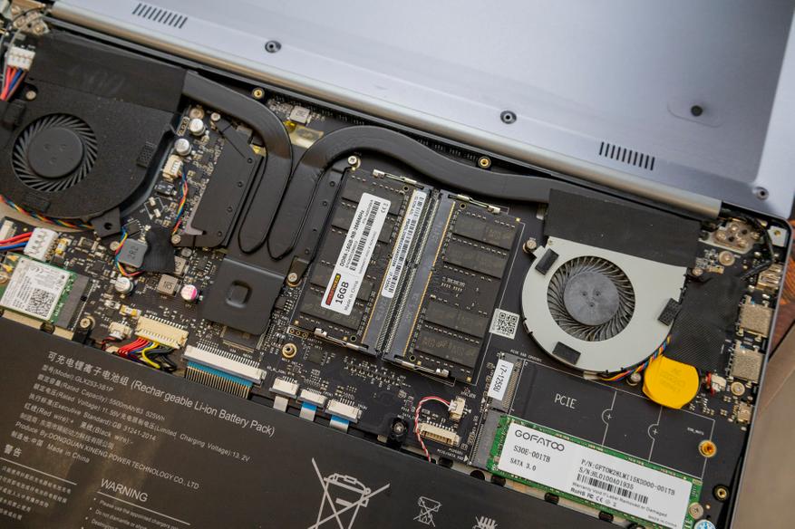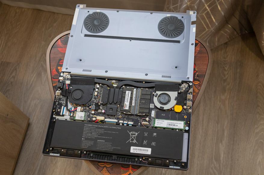 Получить доступ к внутренностям Ninkear N15 Pro, несмотря на отсутствие отдельного окошка, несложно — все винтики на крышке открыты и без пломб. Другое дело, что обратно поставить крышку так, чтобы не оставалось зазоров, мне не удалось с первого или даже со второго раза. Можно приноровиться, хотя в обзорах других моделей Ninkear вижу, что не только у меня возникают проблемы. Внутри ноутбука есть достойно справляющаяся с перегревом система охлаждения из двух вентиляторов и тепловых трубок. Точнее этого хватает для используемого железа, да и уровень шума сравнительно невысокий. Про сменяемые накопители и оперативную память уже упоминалось, а всё остальное доступно ниже на фотографиях.