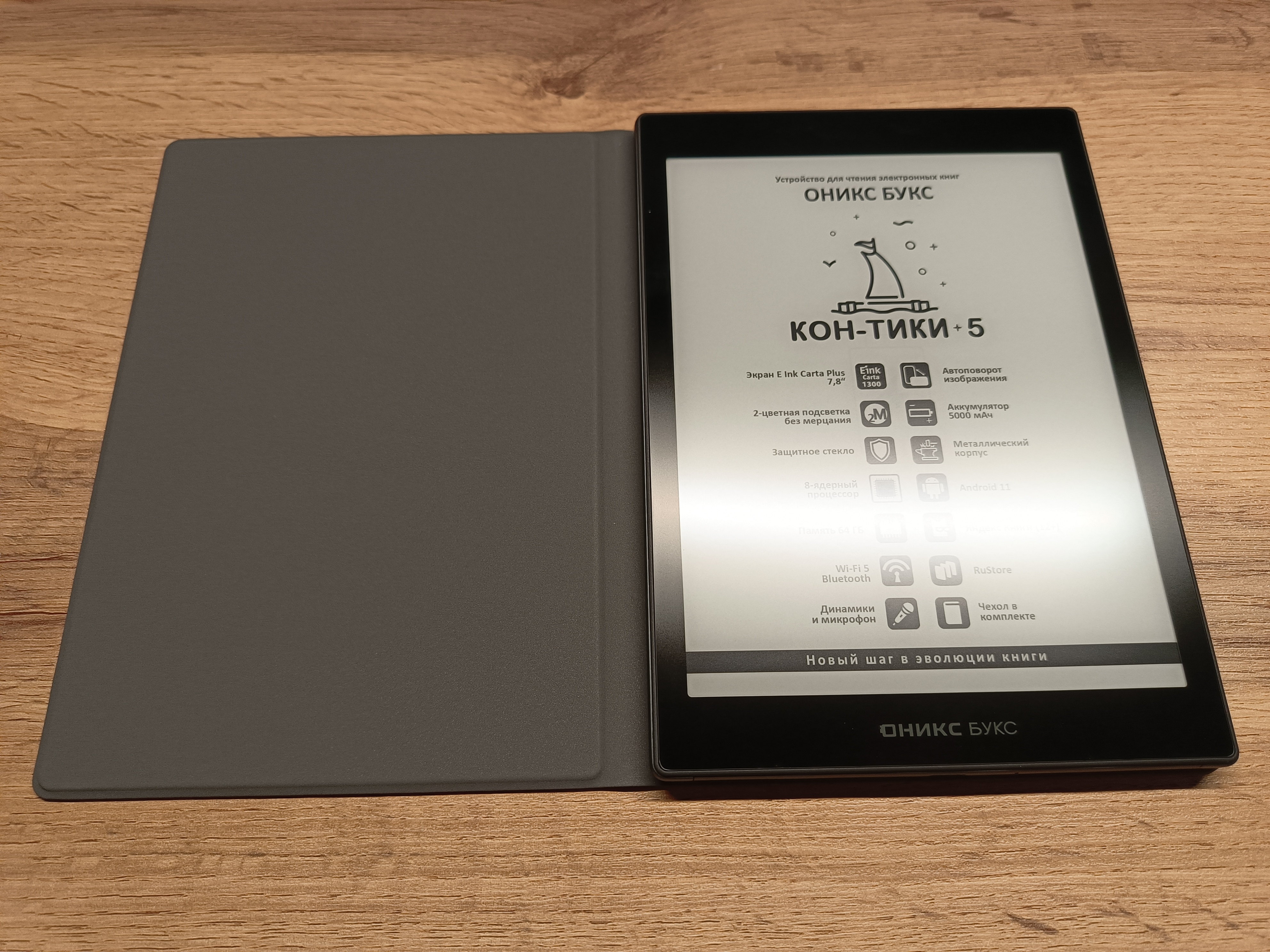 ОНКС БУКС Кон-Тики 5 — это не просто очередной ридер, а настоящий шаг вперёд для тех, кто ценит удобство, функциональность и современный дизайн. Большой 7,8-дюймовый экран с E Ink Carta Plus делает чтение комфортным для глаз, а увеличенная память и мощный восьмиядерный процессор обеспечивают стабильную работу и быстрый отклик. Устройство легко поместится в сумку или рюкзак, а продуманный чехол с функцией автопробуждения превращает ридер в стильный и защищённый гаджет для повседневного использования.