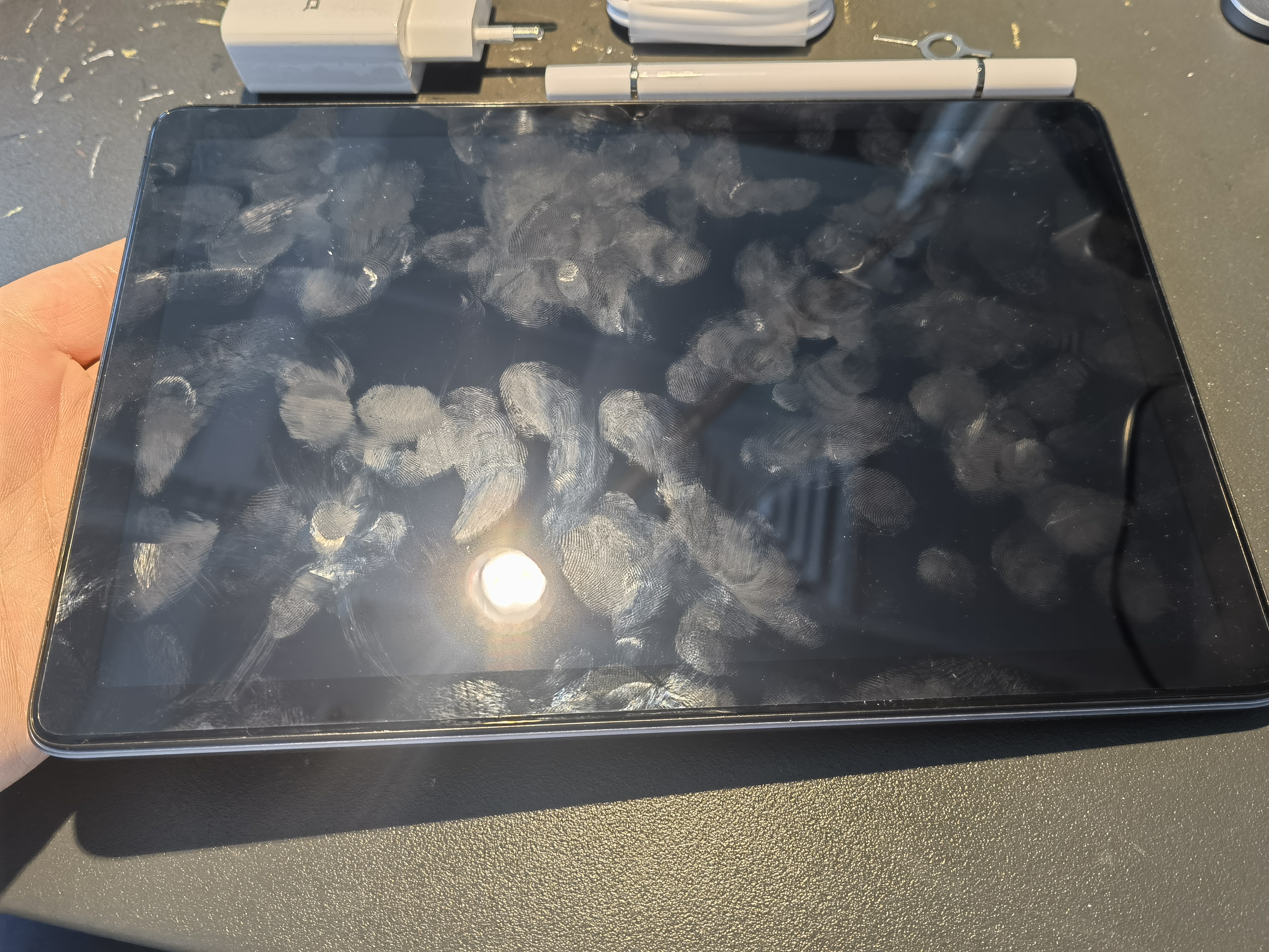 На задней стенке нет ни одного элемента управления, кроме 13МР камеры от Samsung. Второй «глазок» под камеру — муляж (см. подробнее Разборку). Большую часть верхней стороны (81%) занимает дисплей, вверху посередине которого есть 8МР камера также от Samsung. Дисплей, как видно из следующей фотографии, сильно заляпывается и оставляет отпечатки. Управление при помощи рук будет пачкать его, поэтому стилус частично решит проблему.