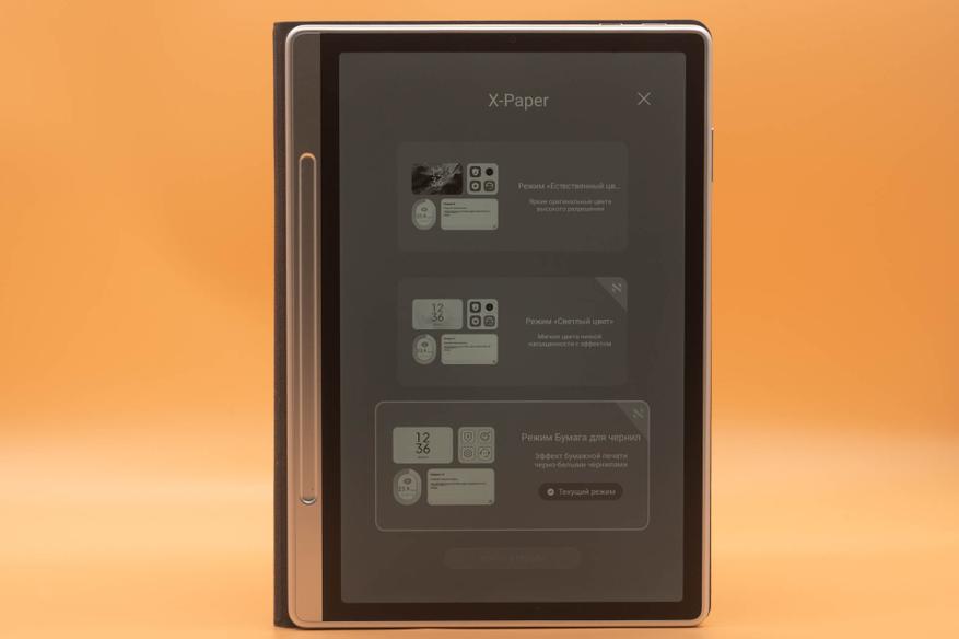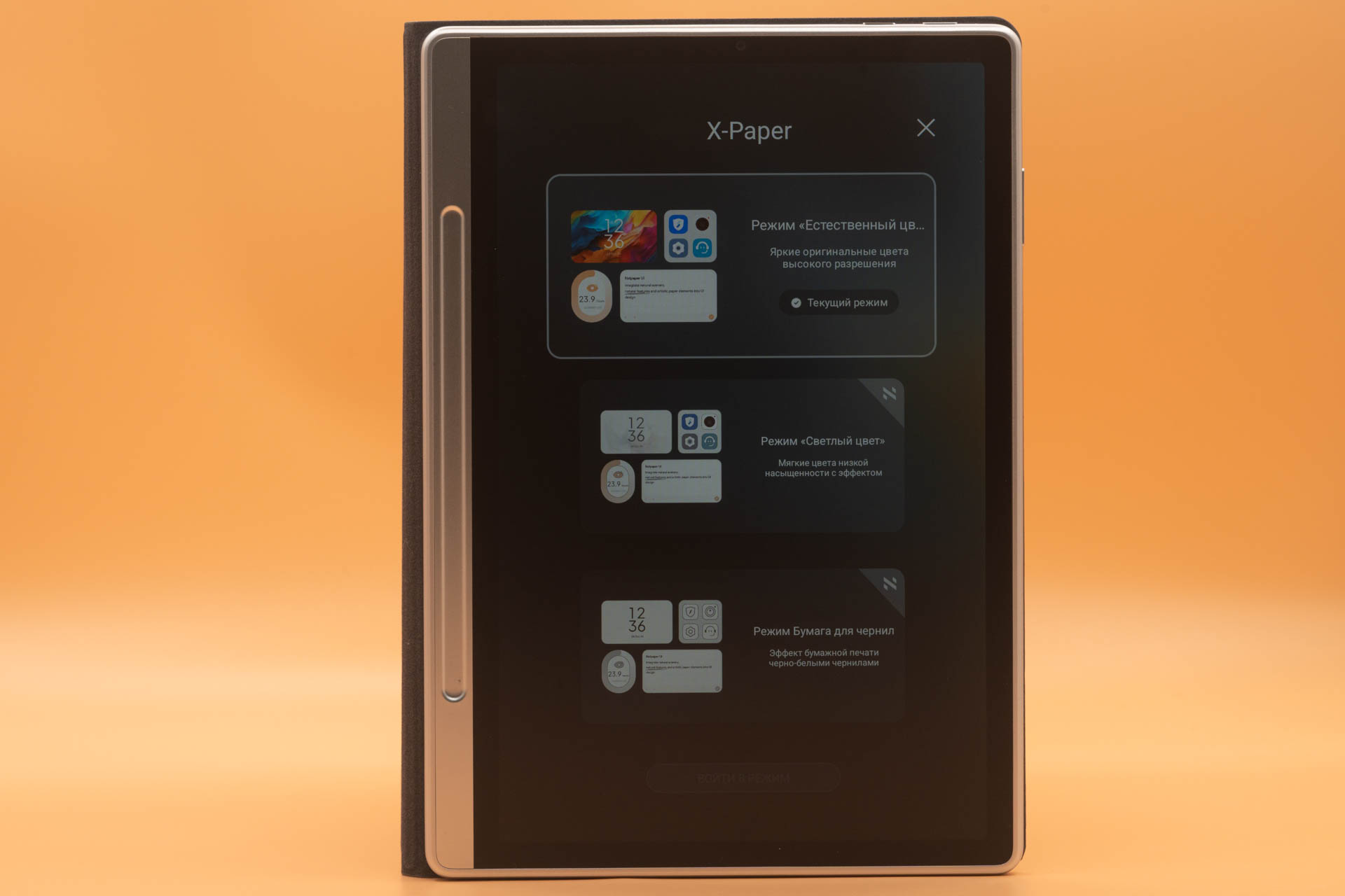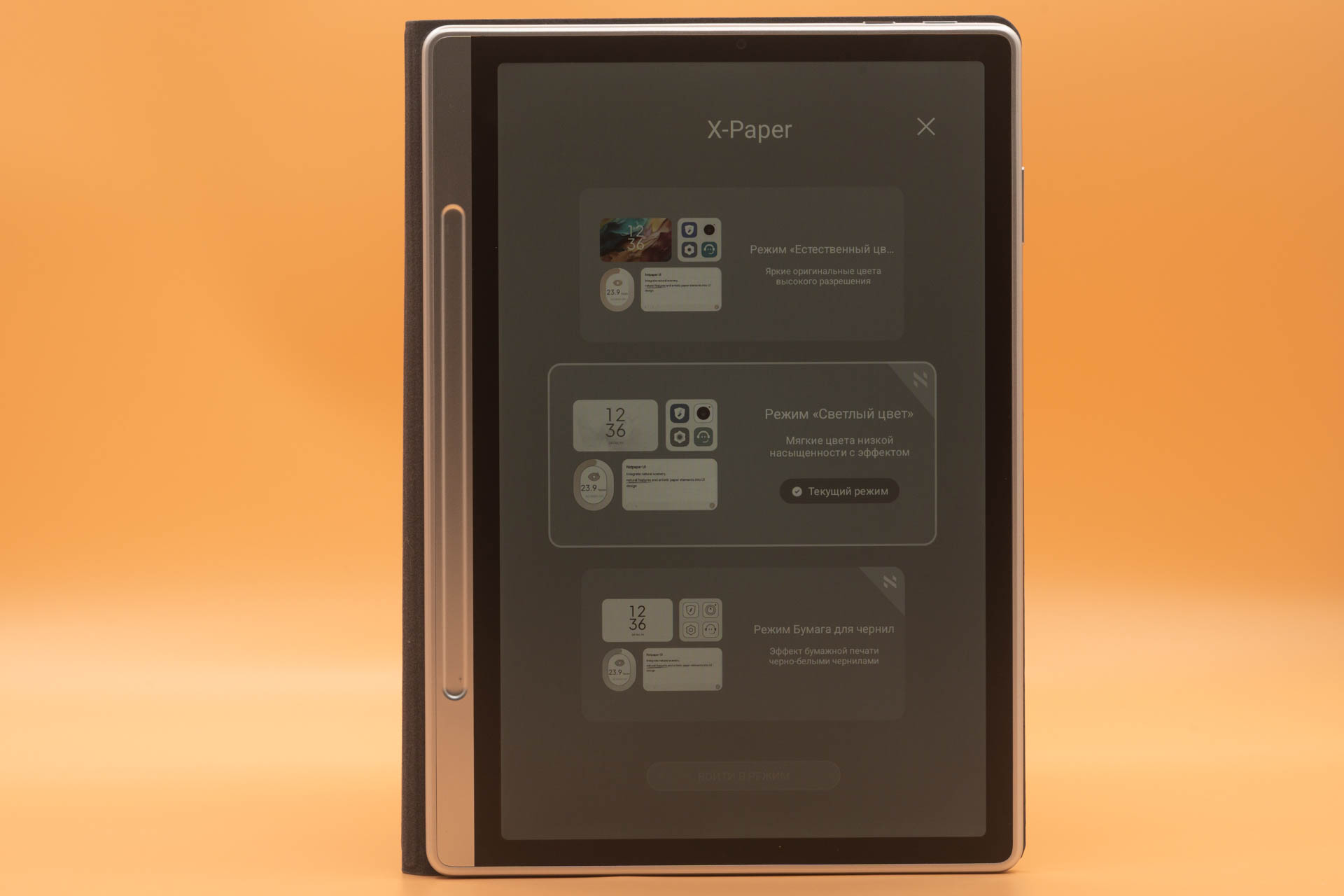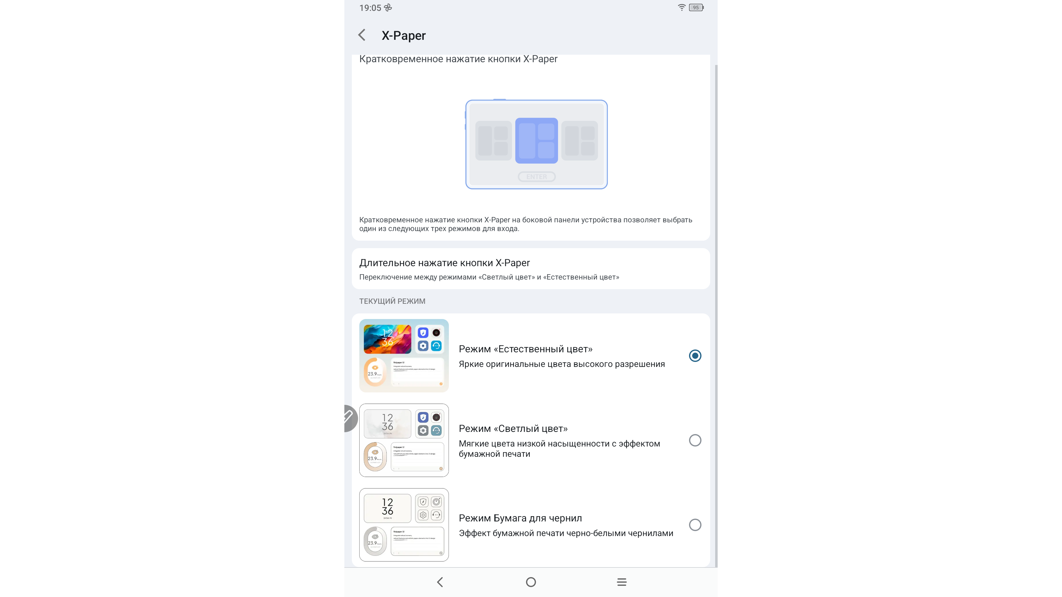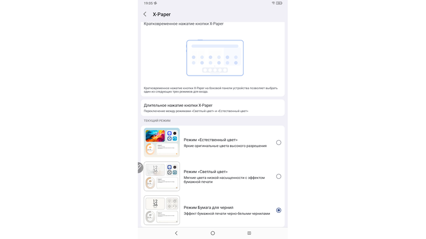 Эта дополнительная кнопка выделяется глянцевой, искрящейся текстурой. Однако, из-за ее близкого расположения к кнопке питания и схожих тактильных ощущений, пользователи иногда их путают. Функция этой кнопки заключается в активации системы X-Paper, предлагающей три варианта цветопередачи: «Натуральный цвет» (по умолчанию), «Яркий цвет» (умеренный) и монохромный режим «Чернильная бумага», который достоверно имитирует экраны E-Ink.