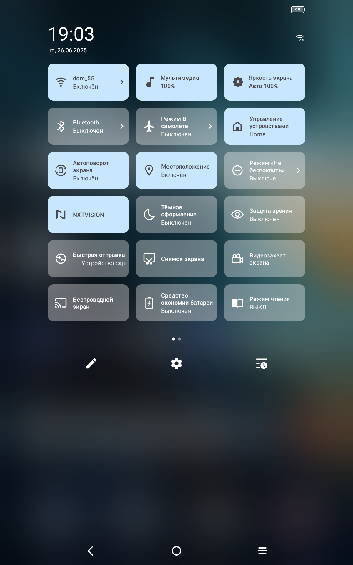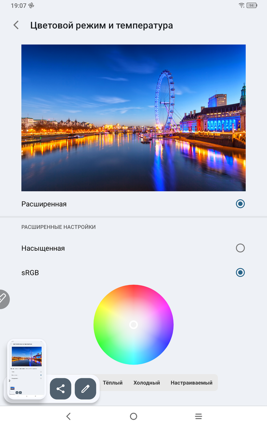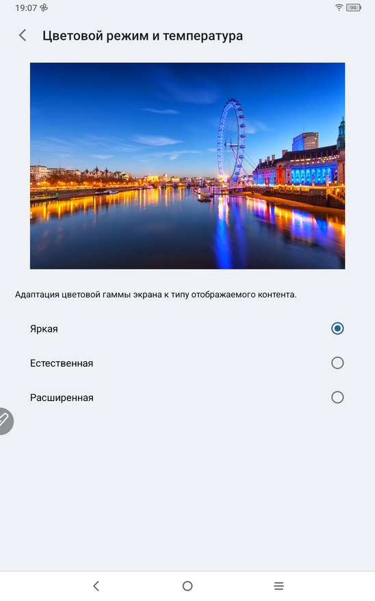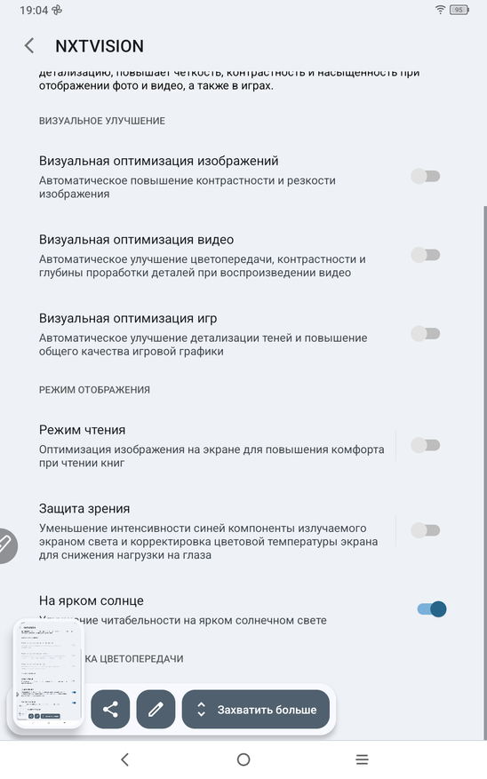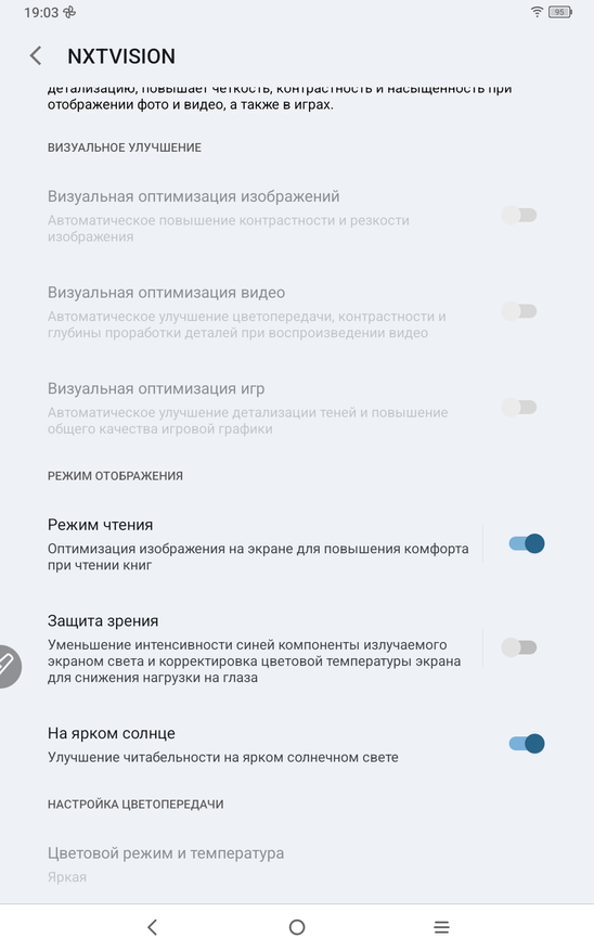Для контроля параметров дисплея в планшете предусмотрено приложение NXTVision. Кратковременное нажатие физической кнопки активирует меню режимов экрана, а запуск самого приложения открывает доступ к расширенному набору инструментов для настройки изображения.