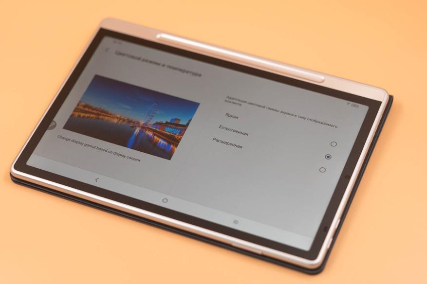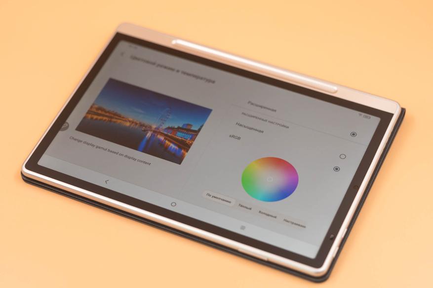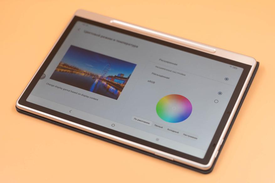 Цветопередача дисплея близка к натуральной, хотя цветовой баланс может незначительно отличаться. В меню настроек доступны четыре предустановленных режима: «Яркий», «Естественный» (с повышенной насыщенностью, контрастом и резкостью), «Насыщенный» и «sRGB». Последние два являются аналогами первых двух, но позволяют пользователю самостоятельно настраивать цветовой баланс.