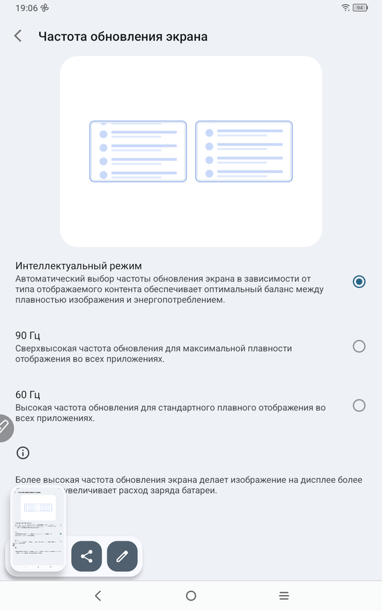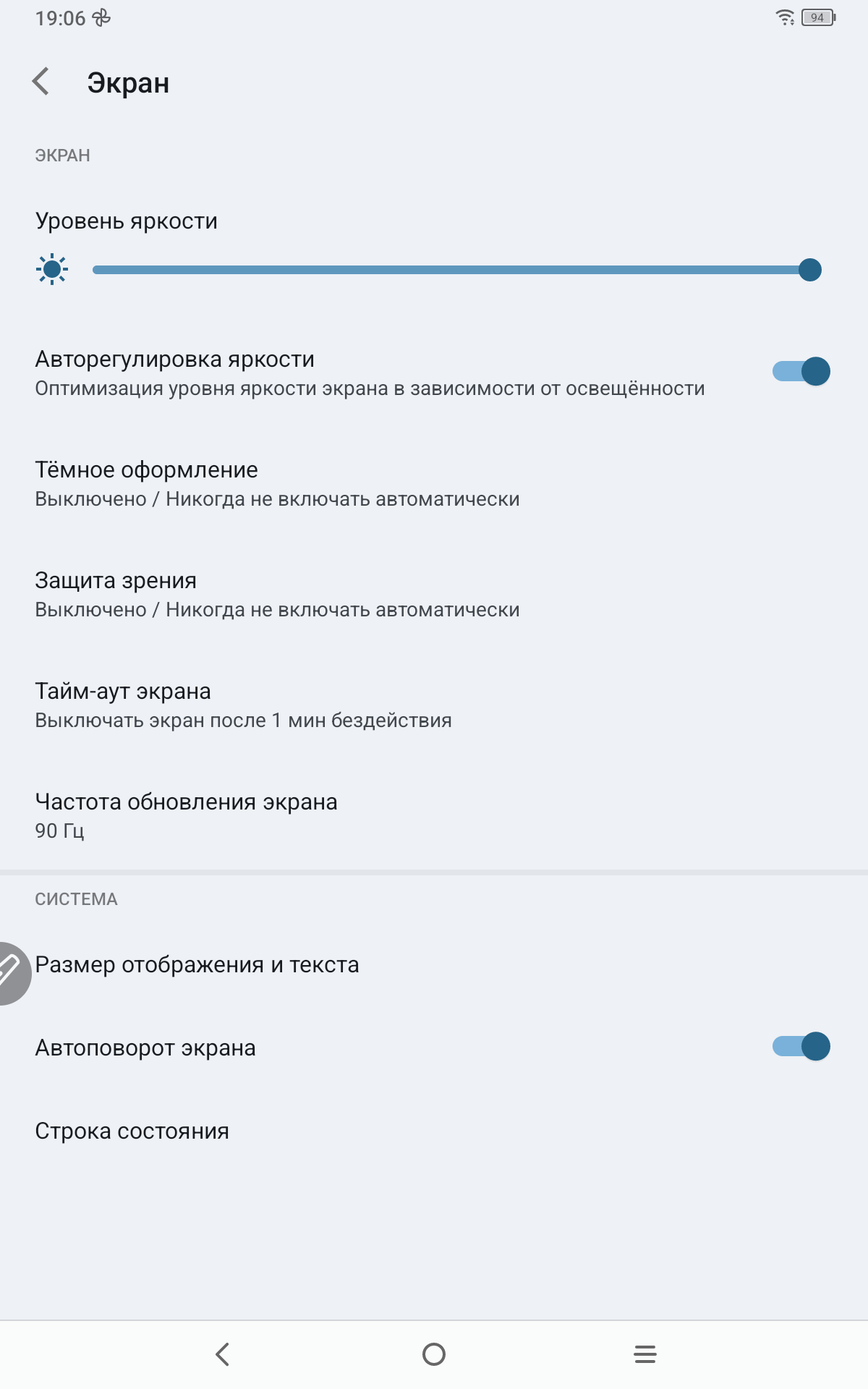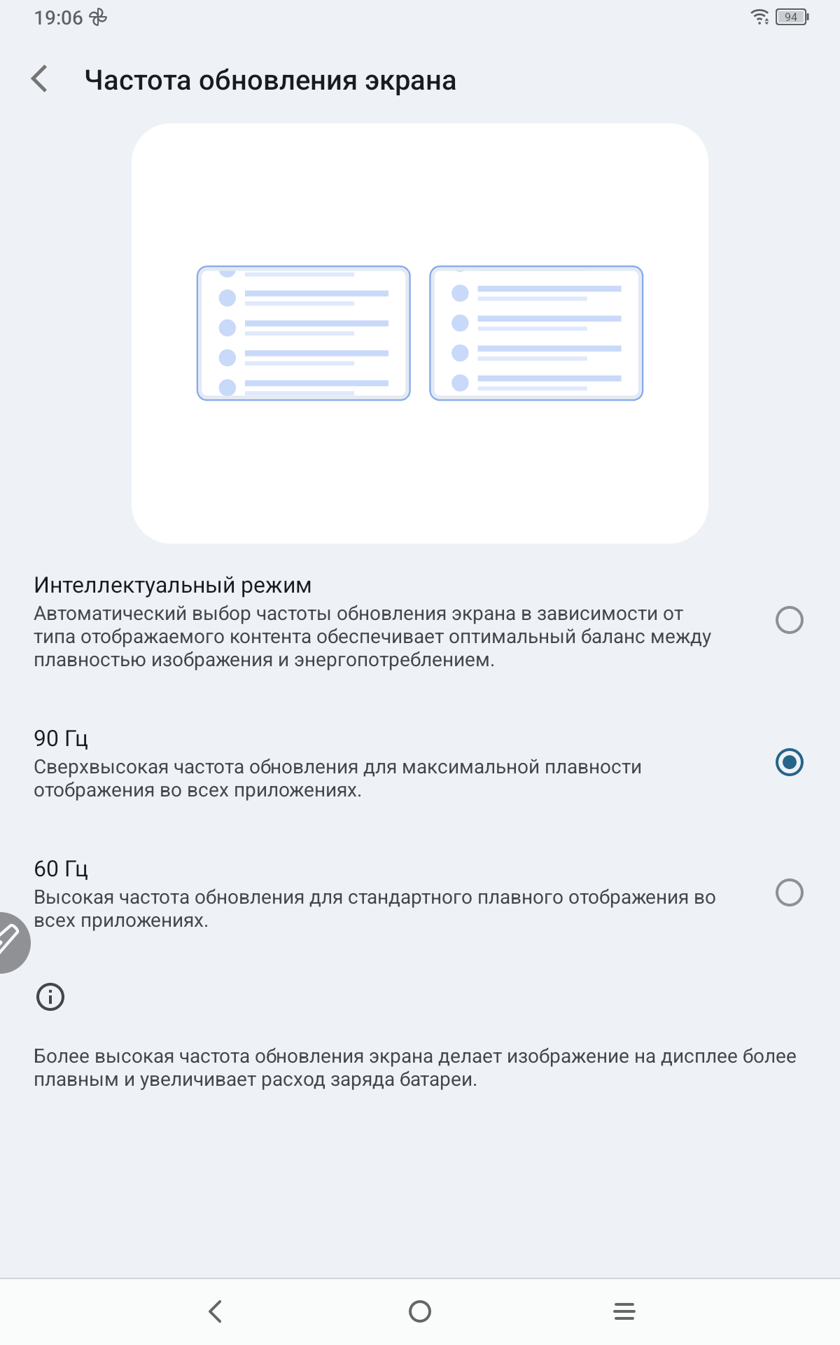 В настройках предусмотрен режим повышенной частоты обновления (90 Гц) для более плавной работы интерфейса. Также реализована функция снижения интенсивности синего света.