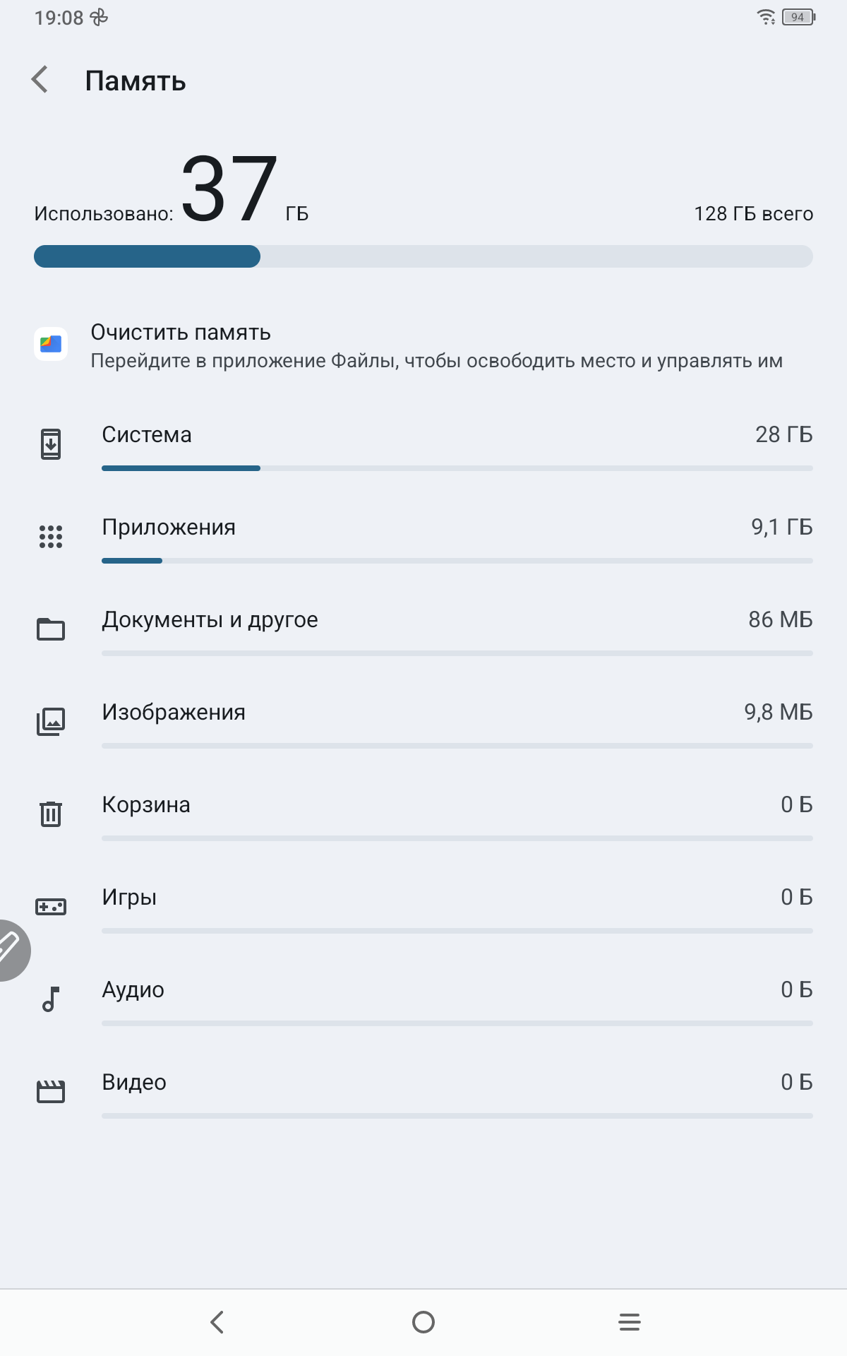 Встроенная память устройства составляет 128 ГБ, что достаточно для целевого использования (рисование, ведение заметок, чтение). Увеличение объема памяти посредством карт microSD не предусмотрено.