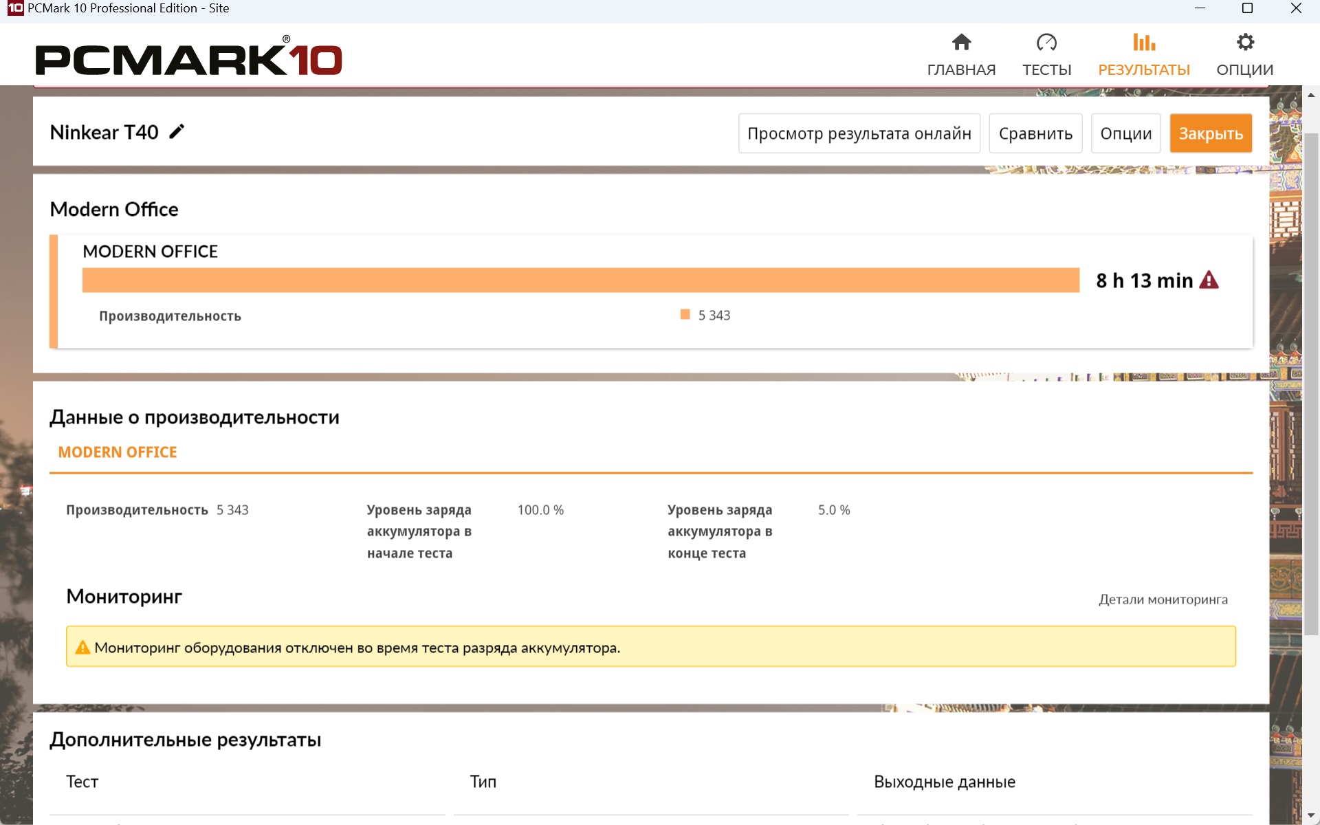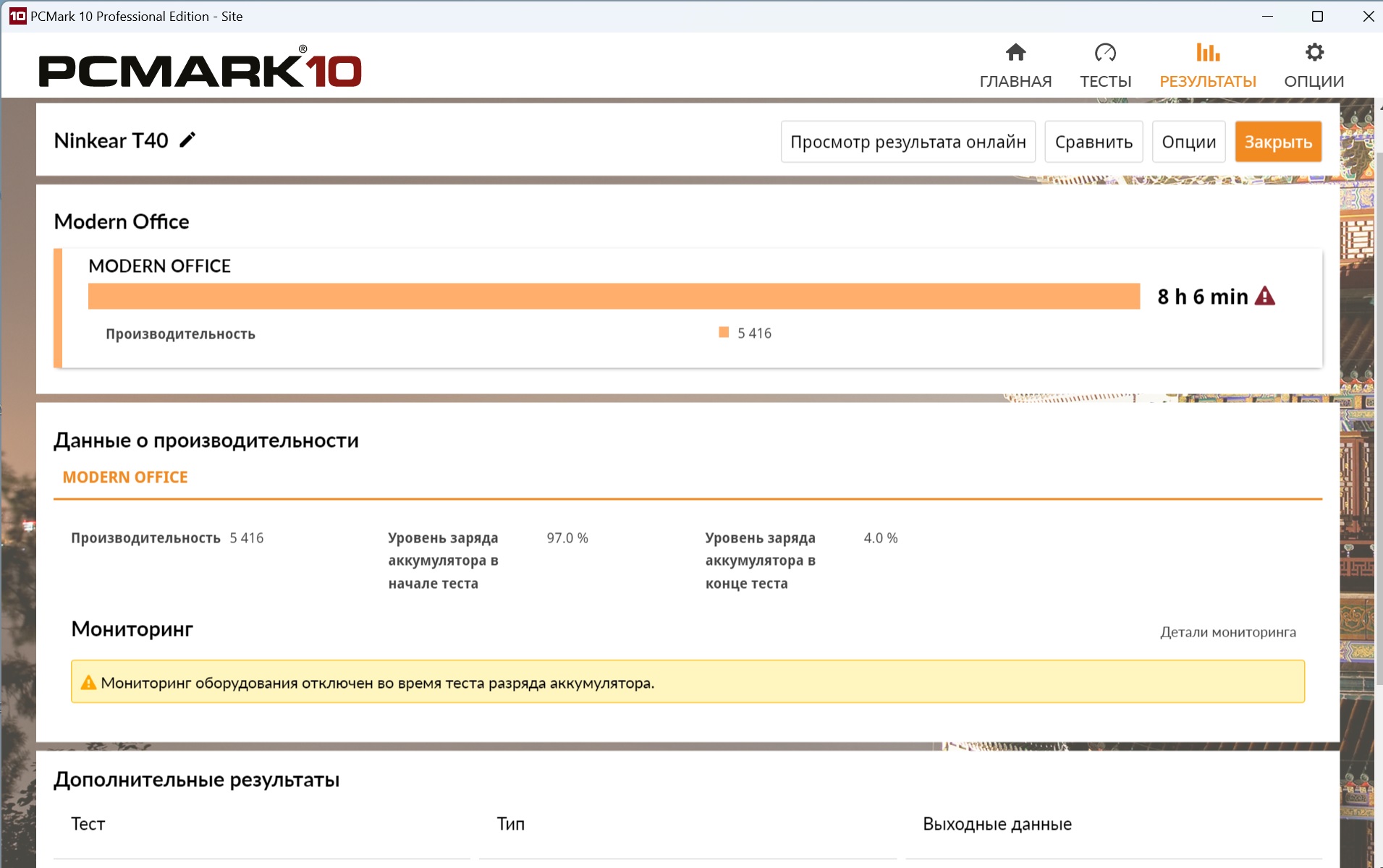 Несмотря на небольшую толщину планшета (10 мм), он оснащен аккумуляторной батареей емкостью 5000 мА*ч (38 Вт*ч). Такая емкость в сочетании с энергоэффективным процессором обеспечивает чуть более 8 часов автономной работы при максимальной яркости. Изменение режима питания практически не влияет на время работы: в режиме максимальной экономии планшет проработал 8 часов 13 минут, в режиме максимальной производительности — 8 часов 6 минут. Для сравнения, Ninkear N14 на процессоре Intel N95 с аккумулятором на 6000 мА*ч (46,2 Вт*ч) продержался всего 5 часов 11 минут.