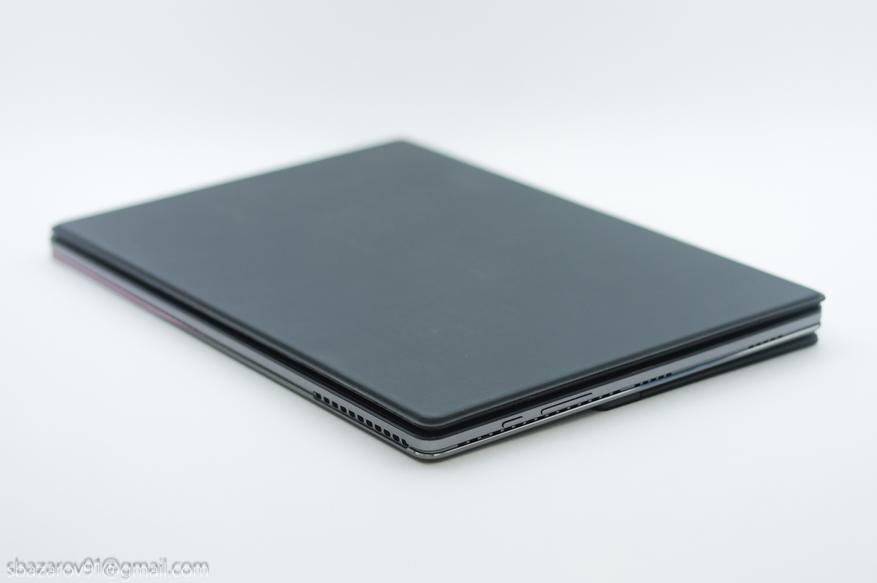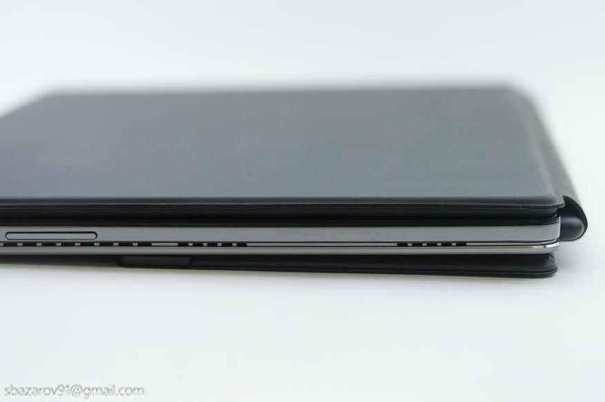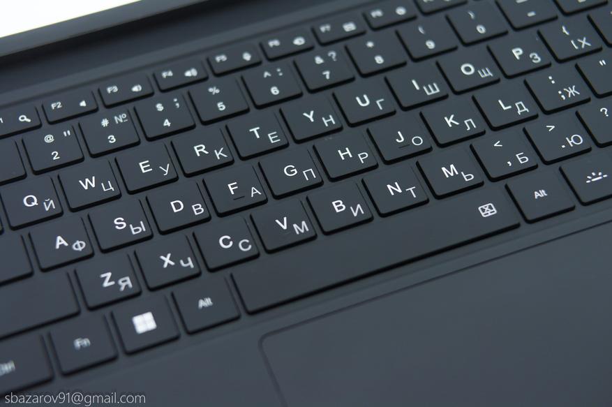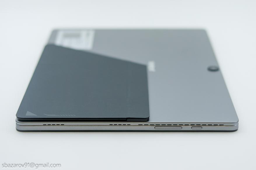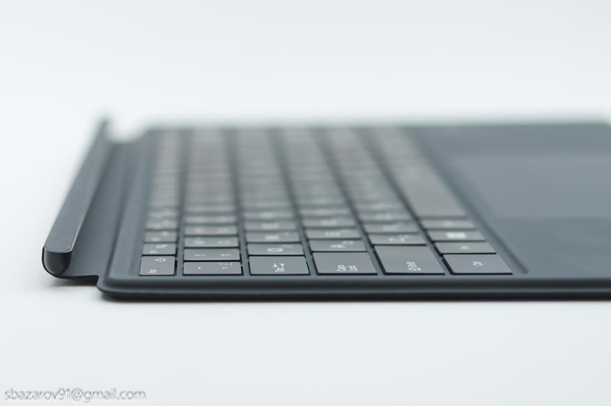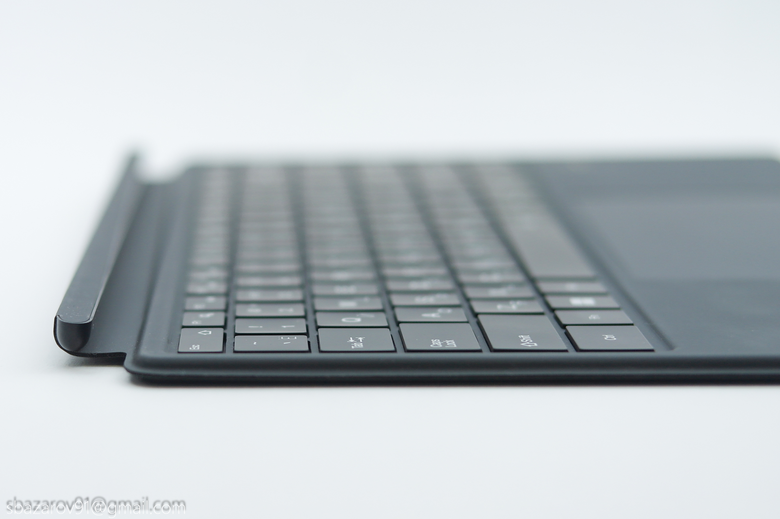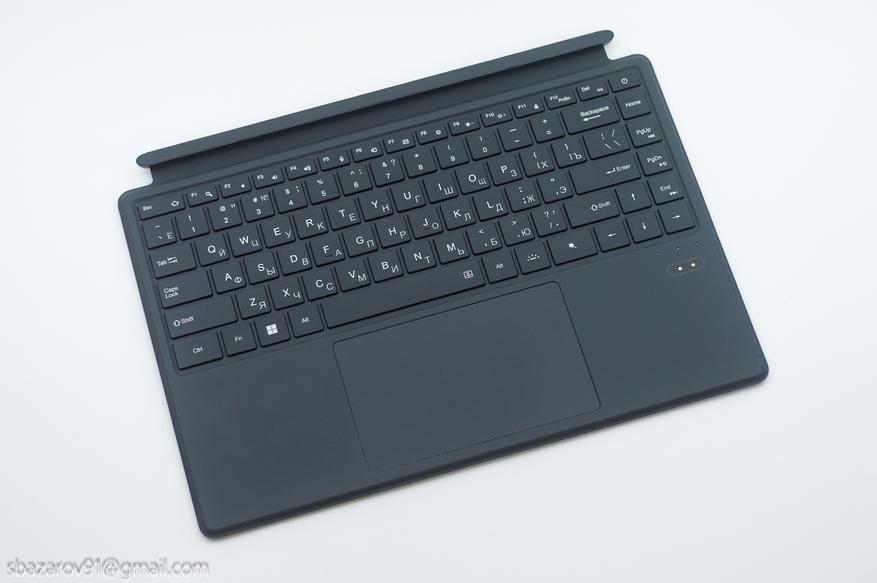 Для зарядки встроенного аккумулятора предусмотрены контакты справа от тачпада, а чуть выше находится индикатор работы клавиатуры. Включение клавиатуры осуществляется нажатием на клавишу питания в верхнем правом углу, так что случайные нажатия не повредят планшету, так как он на них не реагирует. Однако клавиатура легко будит планшет из спящего режима, за что ей стоит отдать должное.