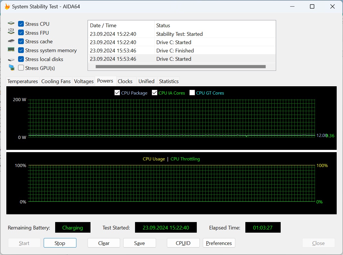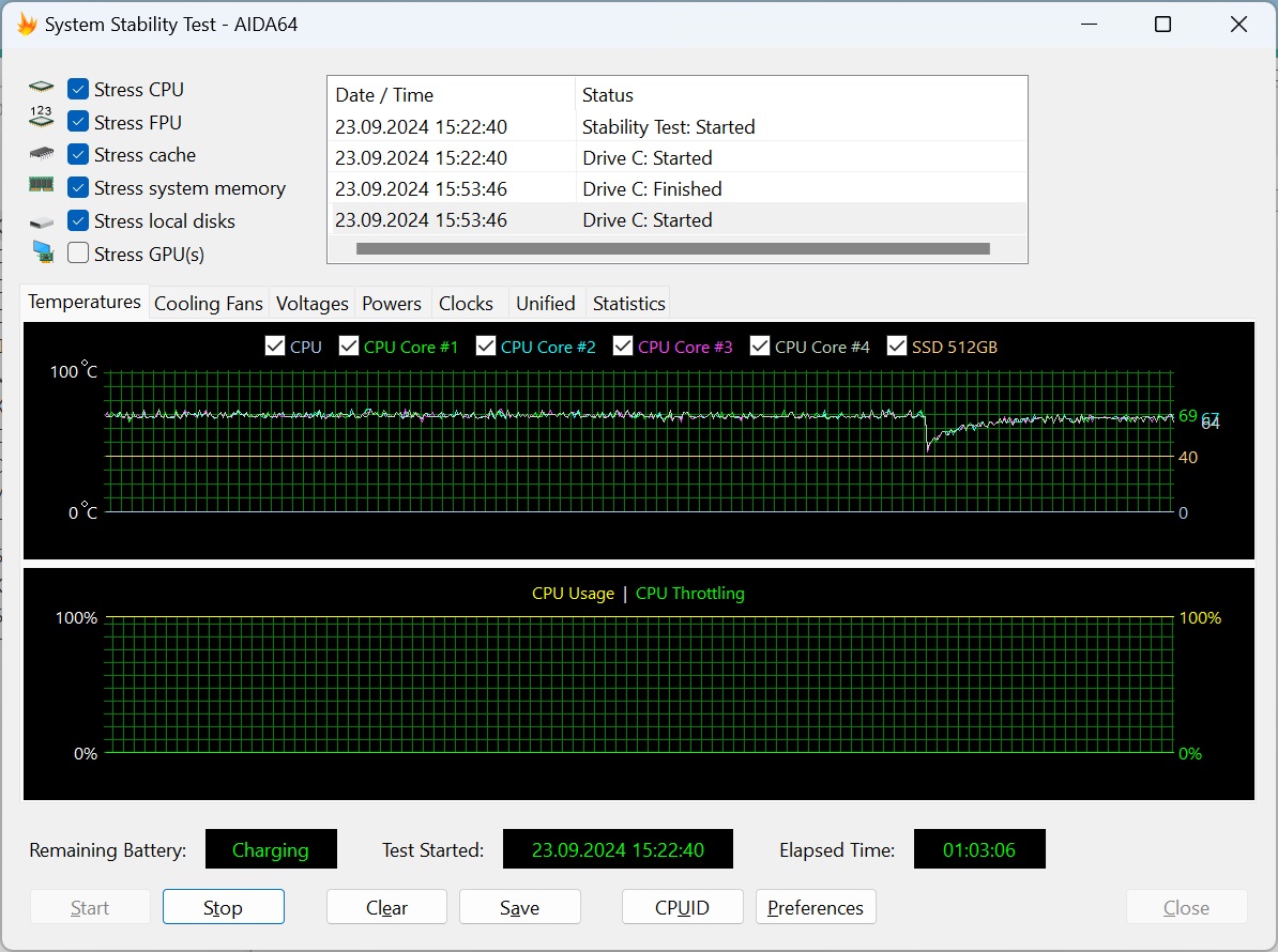 Для проверки стабильности проведем стресс-тест в AIDA64, оставив планшет работать в течение 60 минут. Intel N100 быстро достиг своей пиковой температуры и удерживал ее на протяжении всего теста. Согласно документации Intel, температура, при которой начинается троттлинг, составляет 105°C, в то время как система охлаждения Ninkear T40 поддерживает температуру ядра на уровне 68°C. Интересно, что в стресс-тесте TDP процессора достигает 12 Вт при частоте 2,9 ГГц.