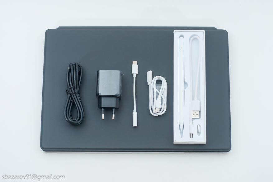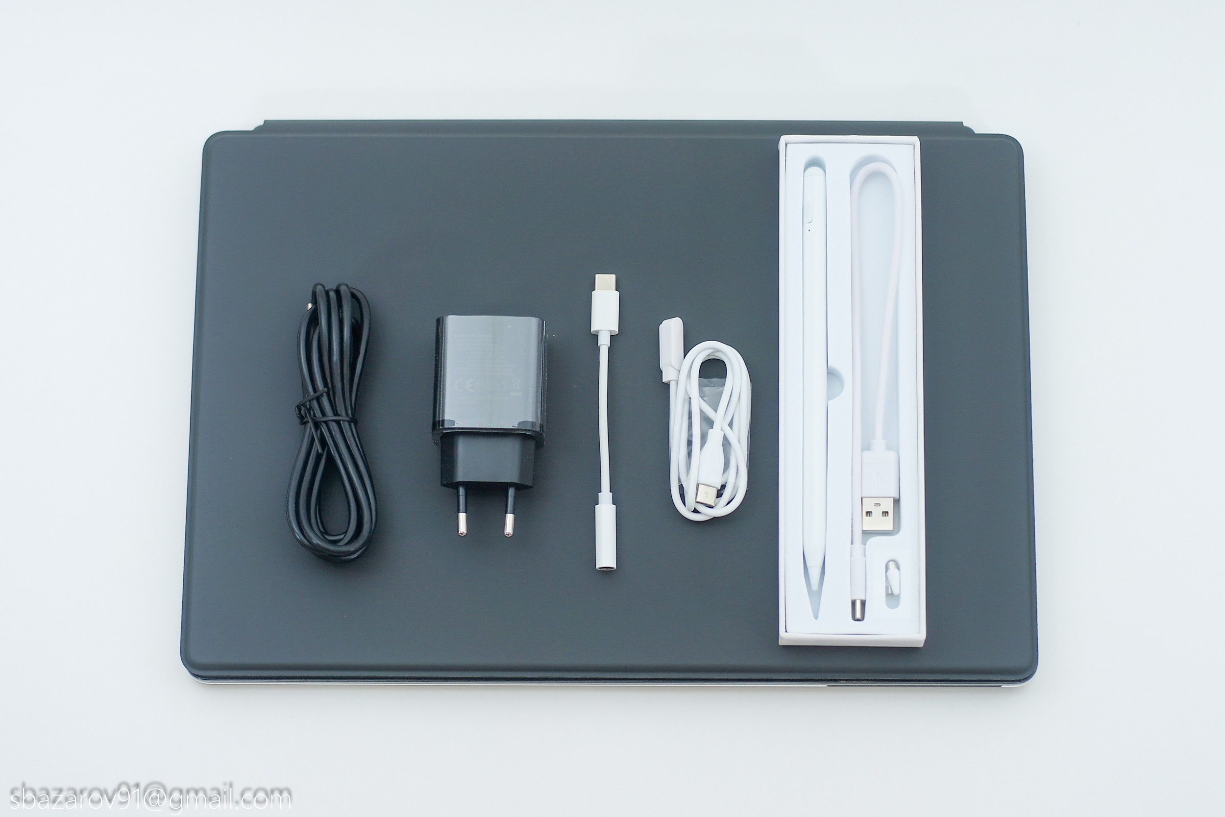 Аксессуары довольно разнообразны: для зарядки планшета используется GaN зарядное устройство мощностью 45 Вт (20 В⎓2.25 А) с выходом Type-C, а для зарядки клавиатуры применяется кабель с PogoPin коннектором и разъемом Type-C. Если вы предпочитаете свои проводные наушники, вам пригодится адаптер с Type-C на 3.5мм аудиоразъем.