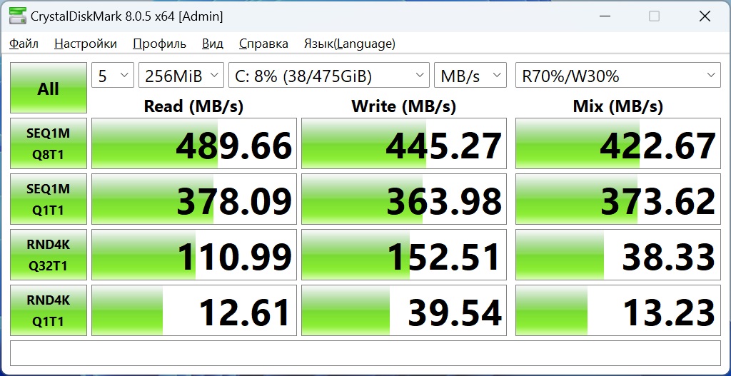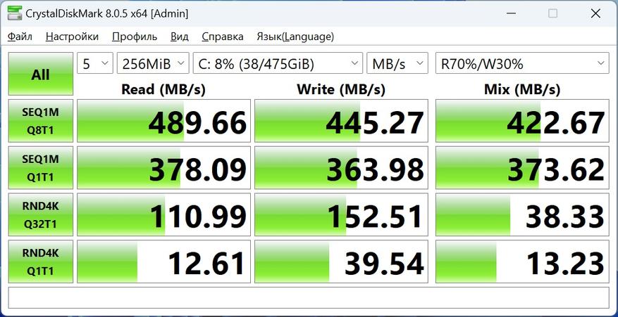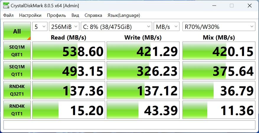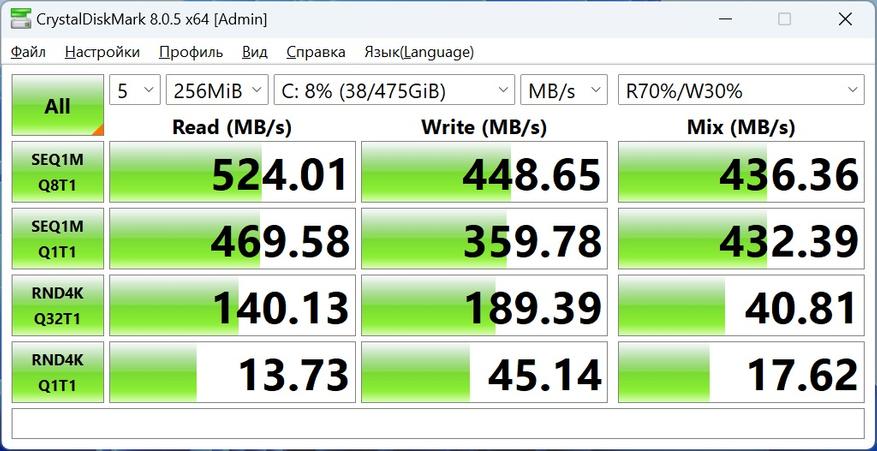 Ninkear T40 оснащен М.2 SSD накопителем объемом 512 ГБ, работающим на скорости SATA3.0. Формат накопителя — 2240, горячая замена не предусмотрена. Изменение режима питания практически не влияет на скоростные характеристики, ограниченные физическими возможностями интерфейса.