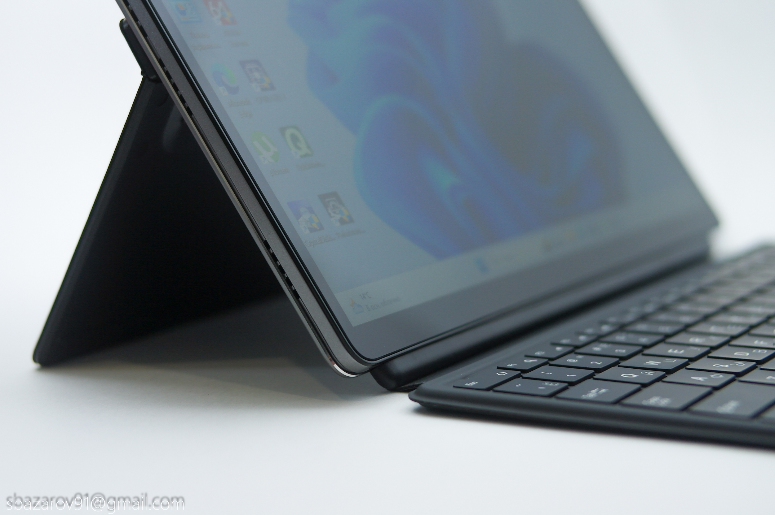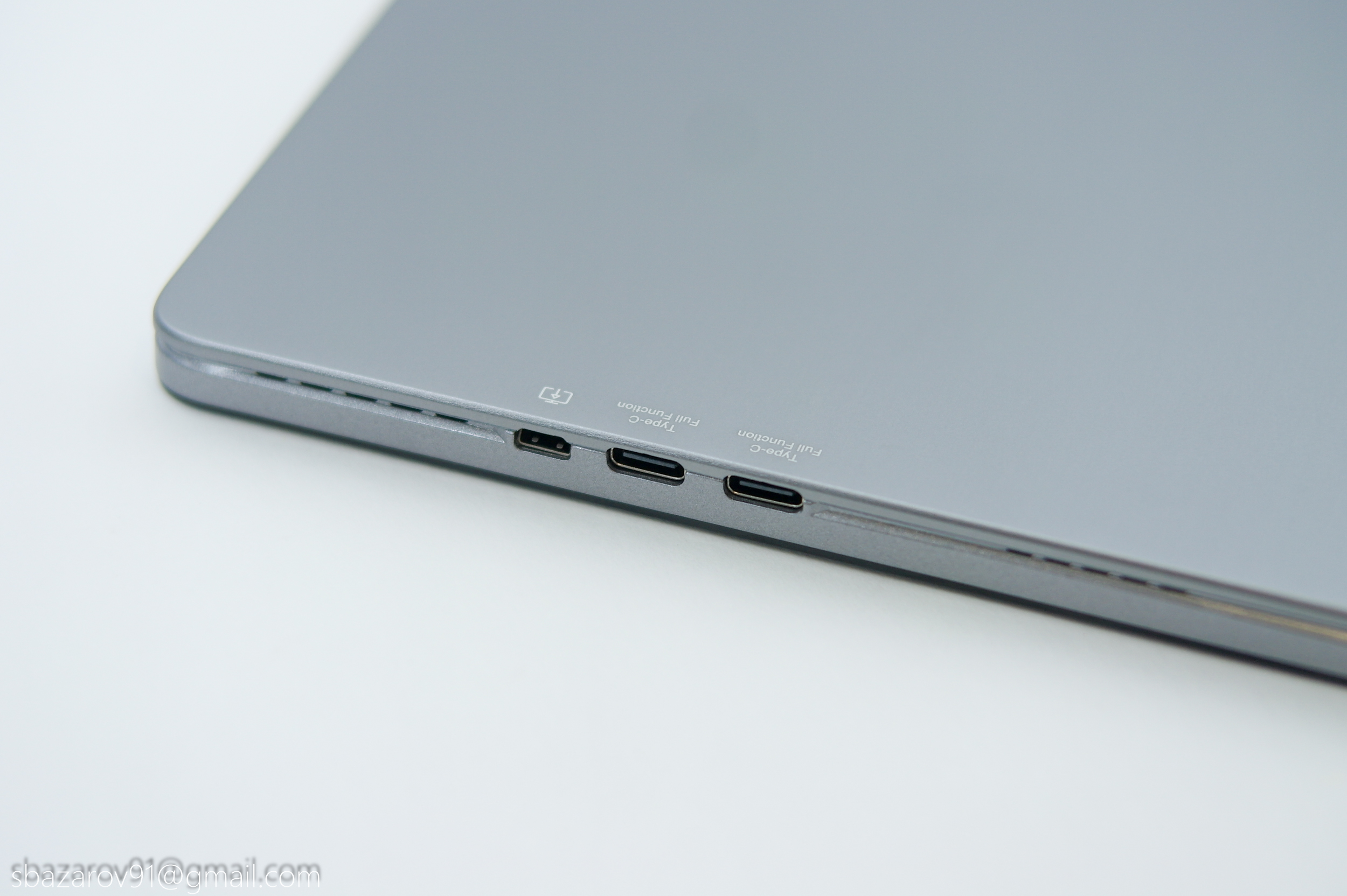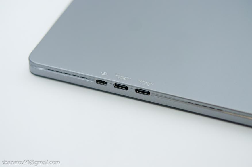 Как и полагается планшету, на левой боковой грани расположены кнопка включения и комбинированная клавиша громкости. В операционной системе Windows 11 нажатие на кнопку включения переводит устройство в спящий режим. На противоположной стороне находятся три порта для подключения внешних устройств: microHDMI и два порта Type-C, поддерживающих зарядку и передачу данных. Из-за компактных размеров планшета (317x215x10 мм) не нашлось места для полноценного порта USB-A. Вес устройства составляет 989 граммов.