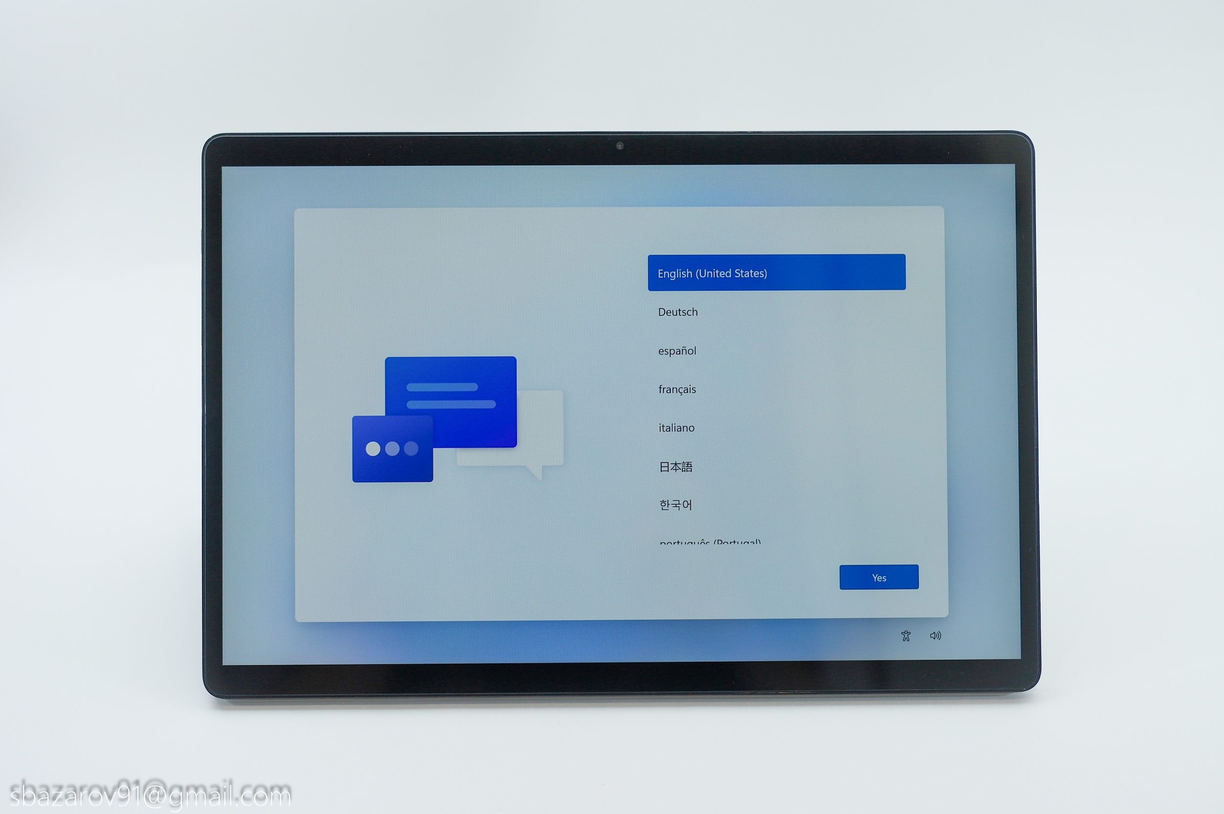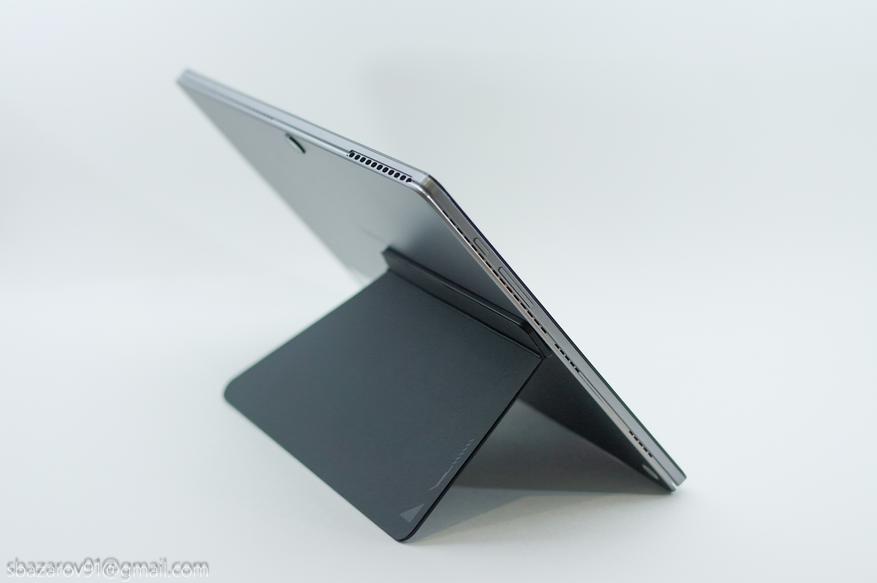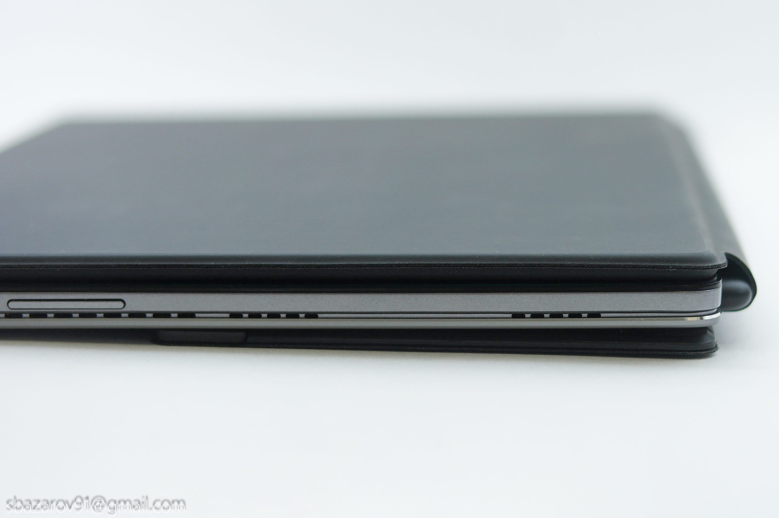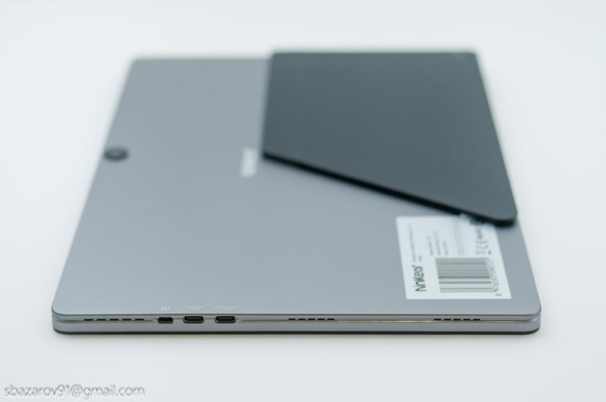 Как и полагается планшету, на левой боковой грани расположены кнопка включения и комбинированная клавиша громкости. В операционной системе Windows 11 нажатие на кнопку включения переводит устройство в спящий режим. На противоположной стороне находятся три порта для подключения внешних устройств: microHDMI и два порта Type-C, поддерживающих зарядку и передачу данных. Из-за компактных размеров планшета (317x215x10 мм) не нашлось места для полноценного порта USB-A. Вес устройства составляет 989 граммов.