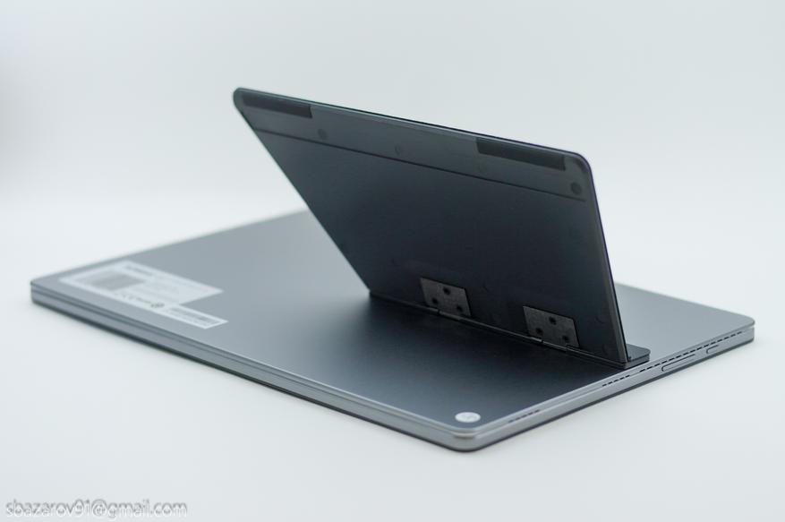 Стоит отметить, что это вторая версия планшетного ПК Ninkear T40, в которой подставка интегрирована в корпус устройства. Ранее она была отдельной конструкцией, крепившейся на магнитах. Максимальный угол открытия обновленной подставки продемонстрирован на втором фото.