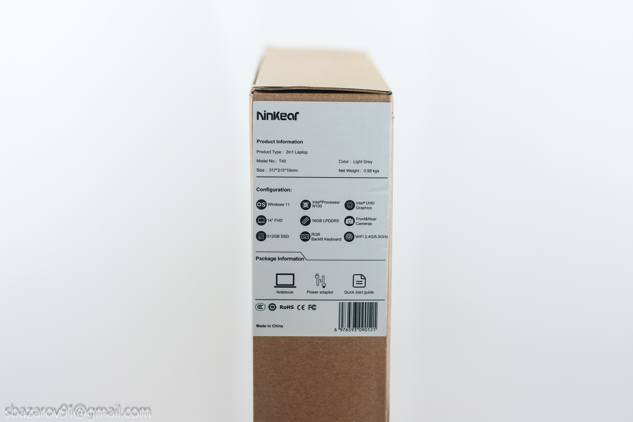 Ninkear T40 поставляется в крупной упаковке из переработанного картона. На одной стороне коробки находится изображение комплекта поставки, а на другой — технические характеристики.