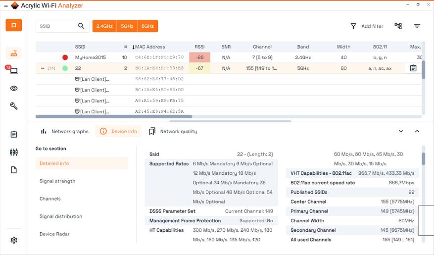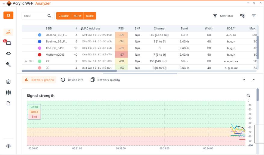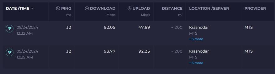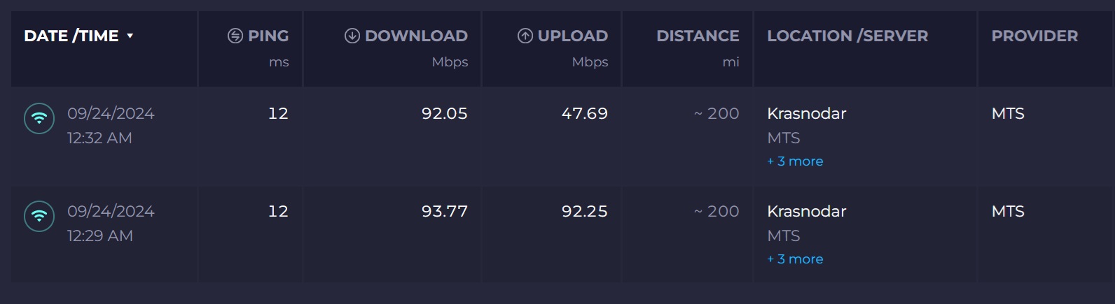 Проверим качество покрытия беспроводной сети. В моем случае используется гигабитный китайский роутер Huawei AX3 Pro с поддержкой Wi-Fi 6 (802.11ax со скоростями 574 Мбит/с на частоте 2.4ГГц и 2402 Мбит/с на частоте 5ГГц). На расстоянии 6 метров от роутера, через две кирпичные стены, скорость загрузки снижается на 48.30%% (с 92.25 Мбит/с до 47.69 Мбит/с). В целом результат не самый худший, так как 50% все же остается.