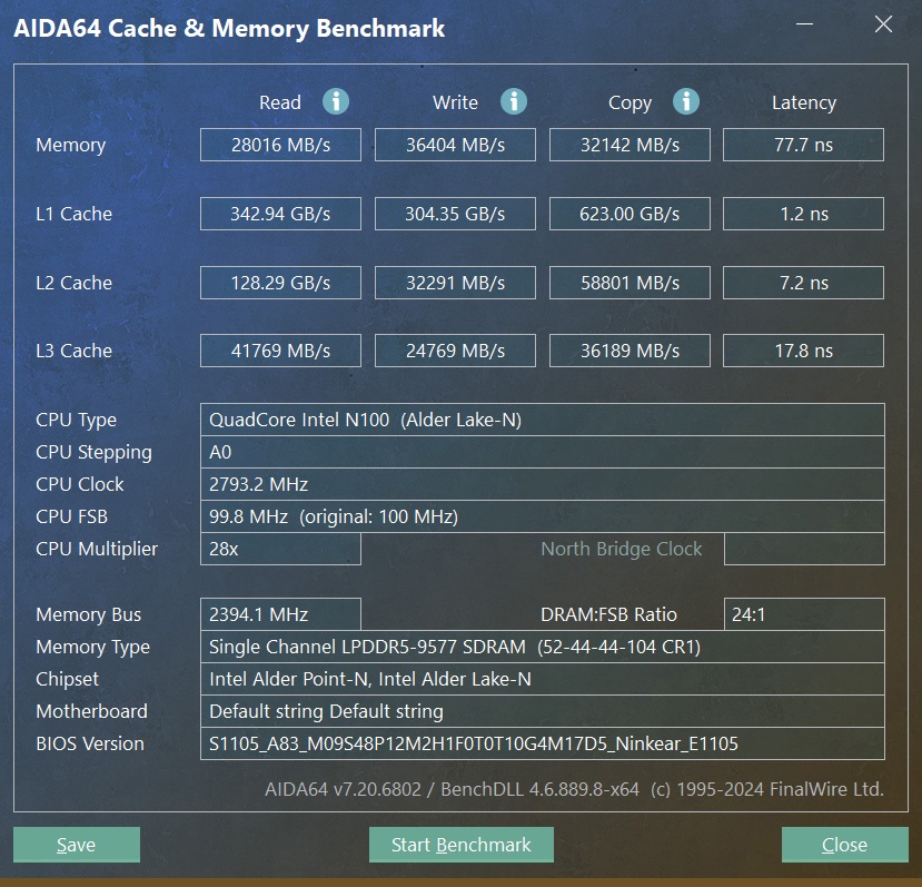 Intel(r) N100 основан на архитектуре Alder Lake-N и поддерживает только одноканальную память DDR4-3200 или DDR5-4800. В случае с Ninkear T40 имеется 16 ГБ оперативной памяти со скоростью 4800 МТ/с (2400 МГц), расширить которую невозможно. Несмотря на высокую частоту, скорость работы памяти остается довольно низкой: при активации высокопроизводительного режима скорость чтения/записи кэша L3 увеличивается на 4,25% и 0,91% соответственно.