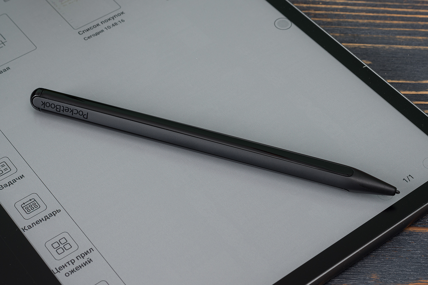Дисплей прикрыт гладеньким стеклом — на ощупь оно такое же, как у современных смартфонов и планшетов. Это важный нюанс: в том же PocketBook 1040D InkPad X Pro никакого дополнительного стекла не было, и пером приходилось водить по чуть шероховатому «голому» дисплею E Ink. Допускаю, что кому-то это и понравится, потому что дисплеи E Ink не только выглядят как бумага, но и напоминают ее на ощупь. Но лично я люблю именно гладкие стеклянные поверхности, так что PocketBook InkPad Eo мне подходит гораздо лучше.