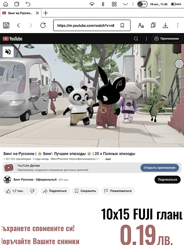 Результат смены настроек заметен, и заметен хорошо, — например, журналы лучше всего выглядят именно при выборе пресета «Журнал», а видео на YouTube мне удалось без пиксельной каши посмотреть только в режиме «Видео». Да, PocketBook InkPad Eo способен воспроизводить ролики — особенно если они не очень динамичные и не содержат очень уж многооттеночных сцен. Скажем, мы с дочкой эксперимента ради посмотрели на InkPad Eo одну из серий детского мультика «Бинг» — и ребенок даже получил удовольствие. Нет, я не считаю, что ридер стоит использовать для видео — это для него исключительно непрофильная задача. И тем не менее он с ней справляется.