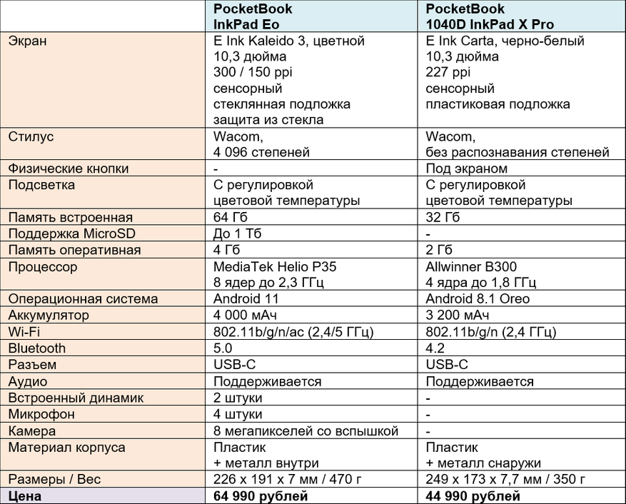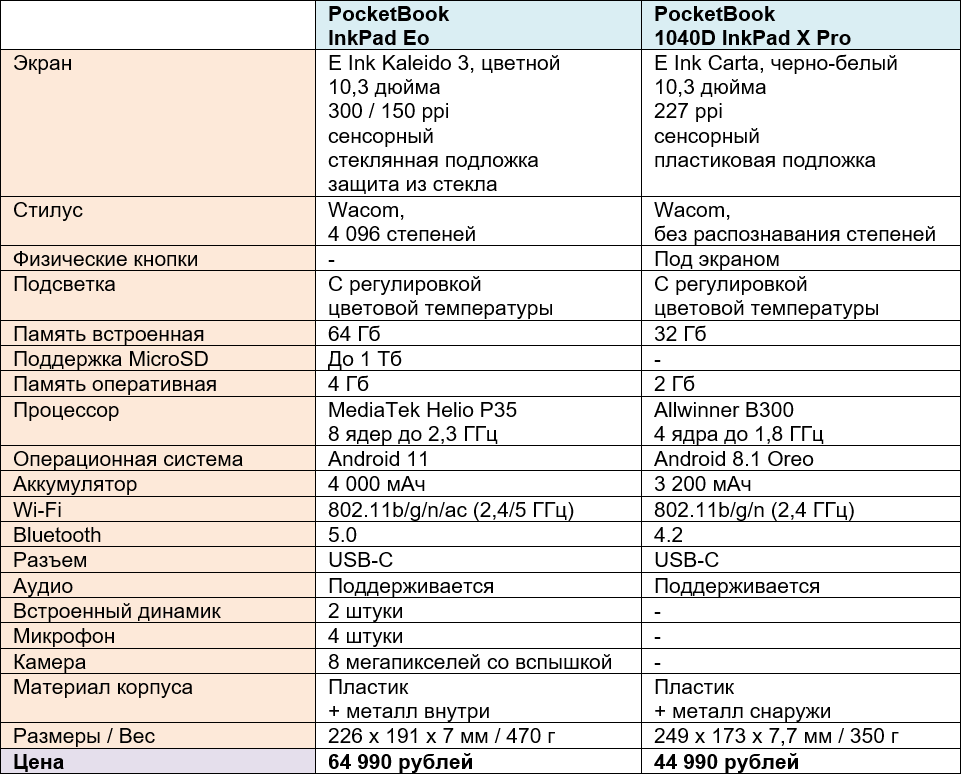 Для начала давайте сопоставим характеристики PocketBook InkPad Eo и PocketBook 1040D InkPad X Pro — чтобы сразу стало понятно, чем новый девайс лучше старого.