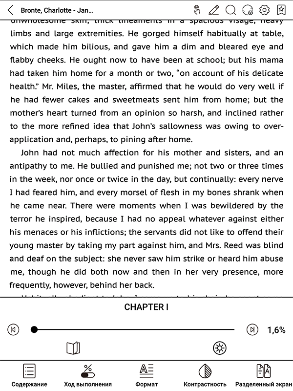 Подсветка реализована на стандартном для современных ридеров уровне — есть как опция изменения яркости, так и опция регулировки цветовой температуры. Нюанс в том, что даже если передвинуть ползунок в самую левую часть шкалы оттенка, свет будет не белым, а желтоватым. Сдвигаем вправо — и он почти сразу становится оранжевым, ну и дальше по мере сдвигания ползунка он превращается уже совсем в апельсиновый. А вот чистого белого света, по сути, и нет. Меня это нисколько не раздражает — я всегда делаю подсветку экранов ридеров чутка желтоватой, так она получается более «ламповой». Но кому-то отсутствие белого может и не понравиться.