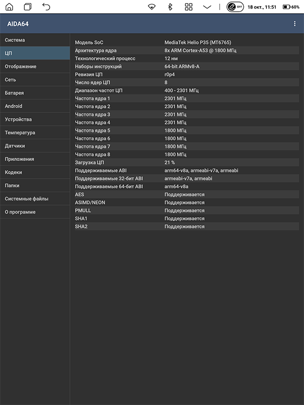 На сайтах PocketBook о платформе героя этого материала ничего не пишут — точнее, говорят, что она восьмиядерная с частотой до 2,3 ГГц. На помощь пришла AIDA64: приложение сообщило, что ридер-блокнот базируется на хорошо знакомом чипсете MediaTek Helio P35.