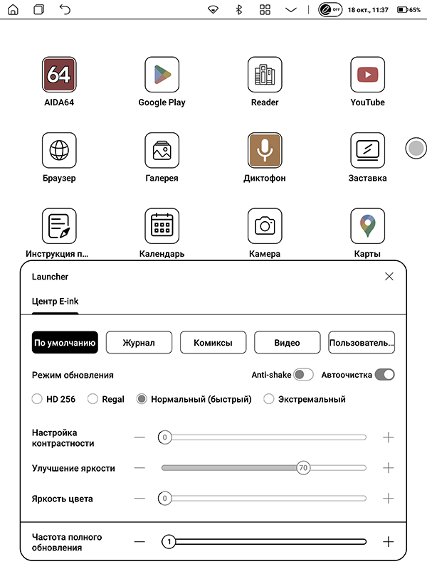 Экран предлагает массу пресетов для различных ситуаций — они собраны в меню «Центр E Ink». Можно выбрать вариант для комиксов, видео, журналов — в результате переключения меняются режим обновления, яркость и некоторые другие параметры. Есть и пользовательский вариант, в котором все это можно настраивать вручную.