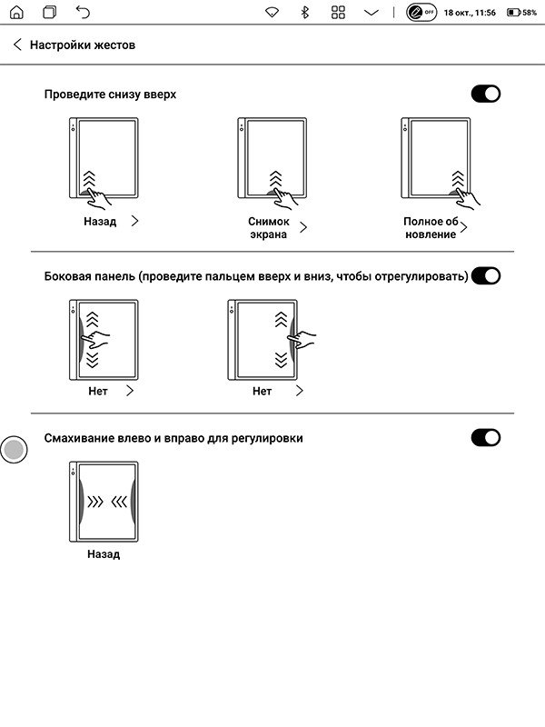 Главное меню настроек, напротив, не очень насыщенное — все лишнее для ридера разработчики выпилили. В принципе, оно и правильно — чем меньше в системе бесполезного хлама, тем быстрее она работает.