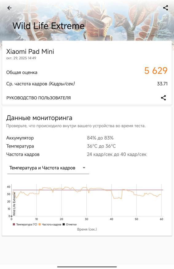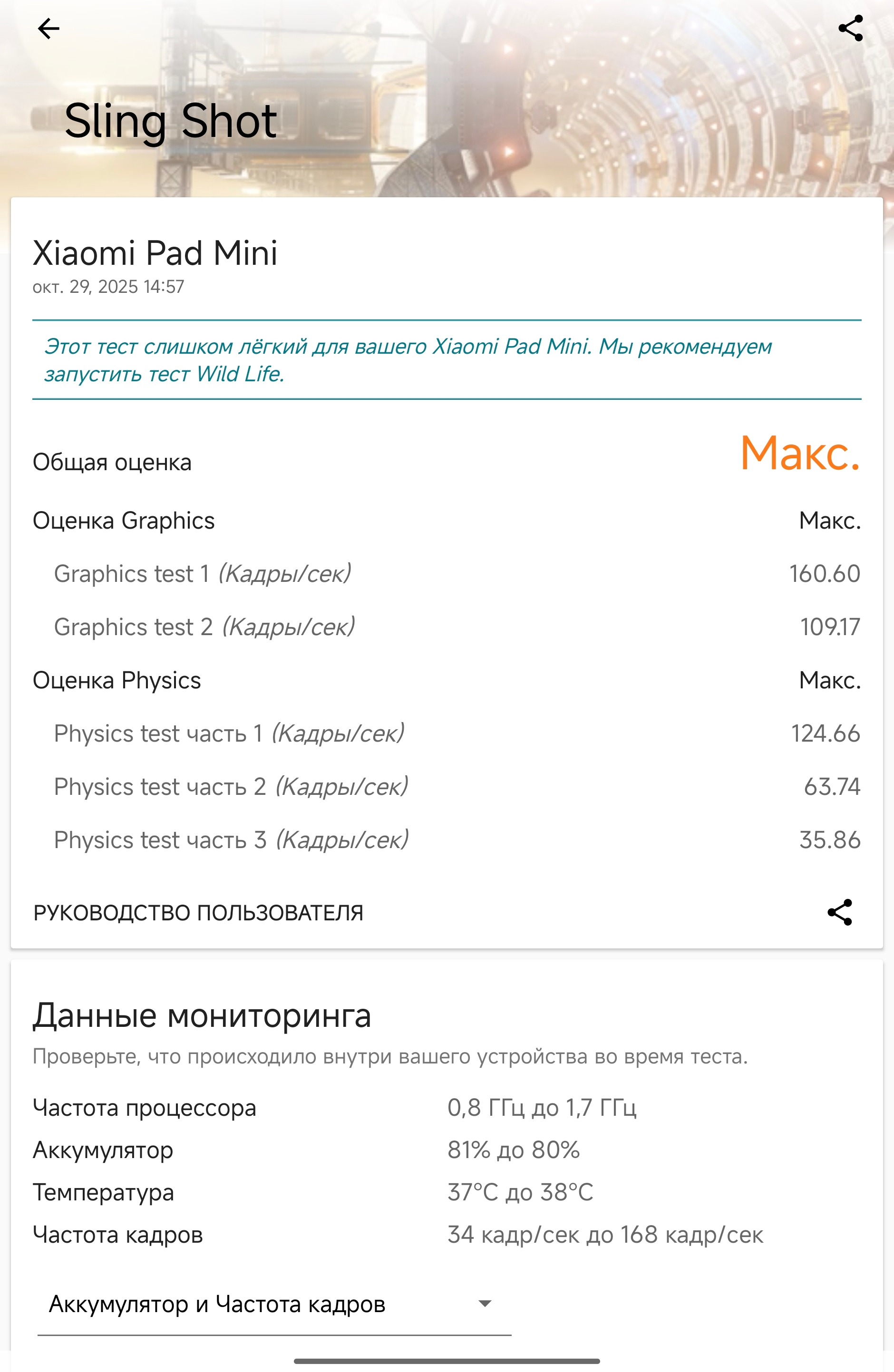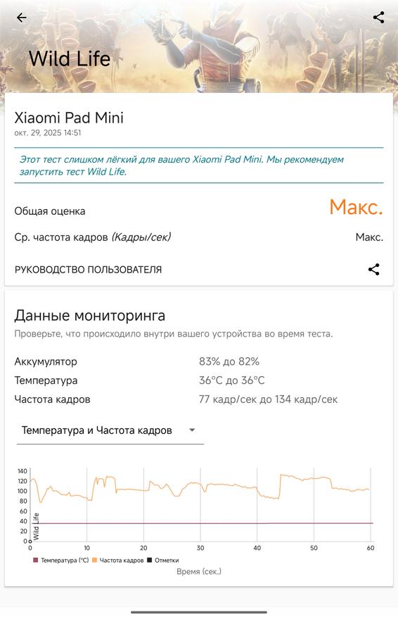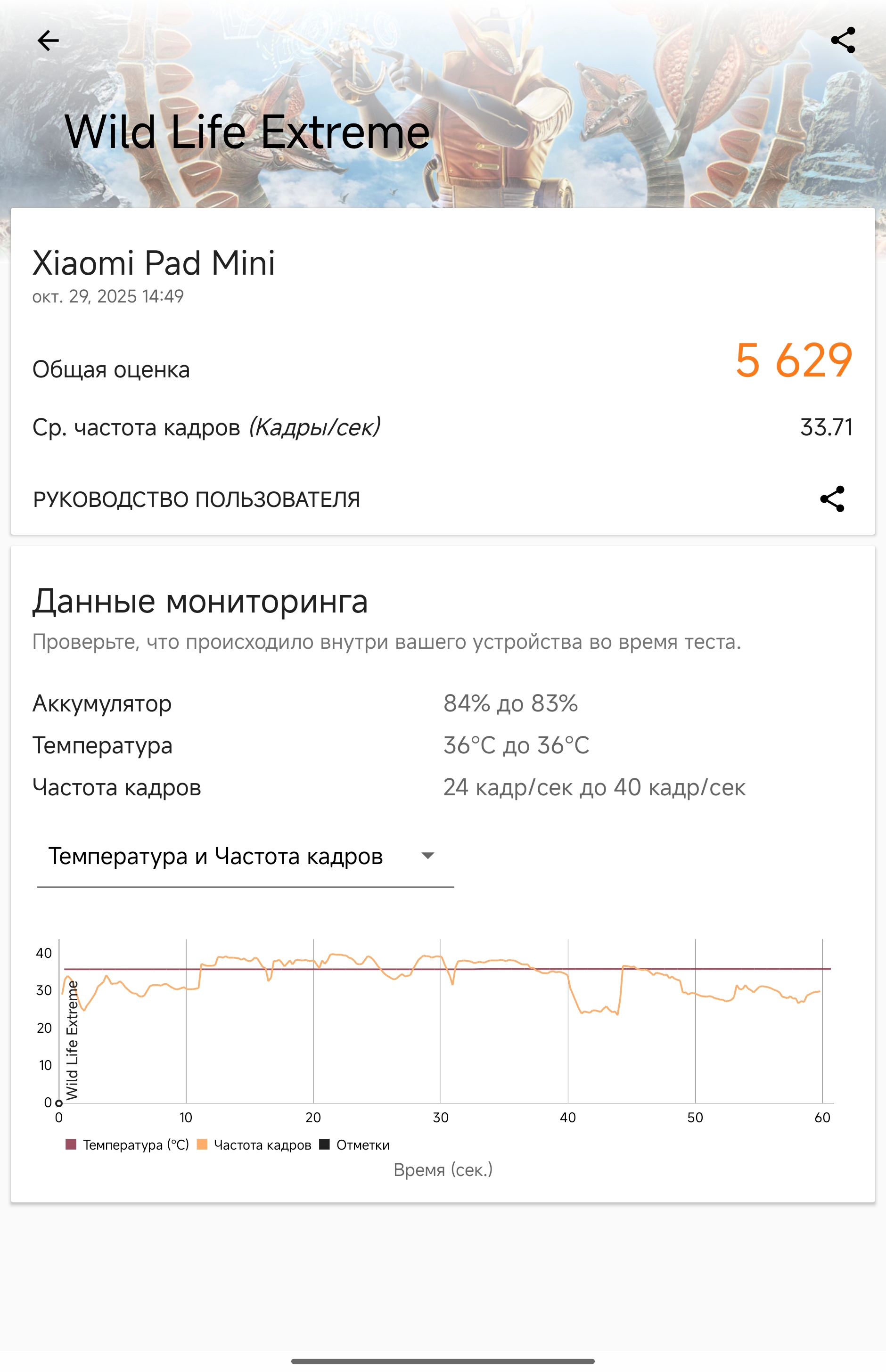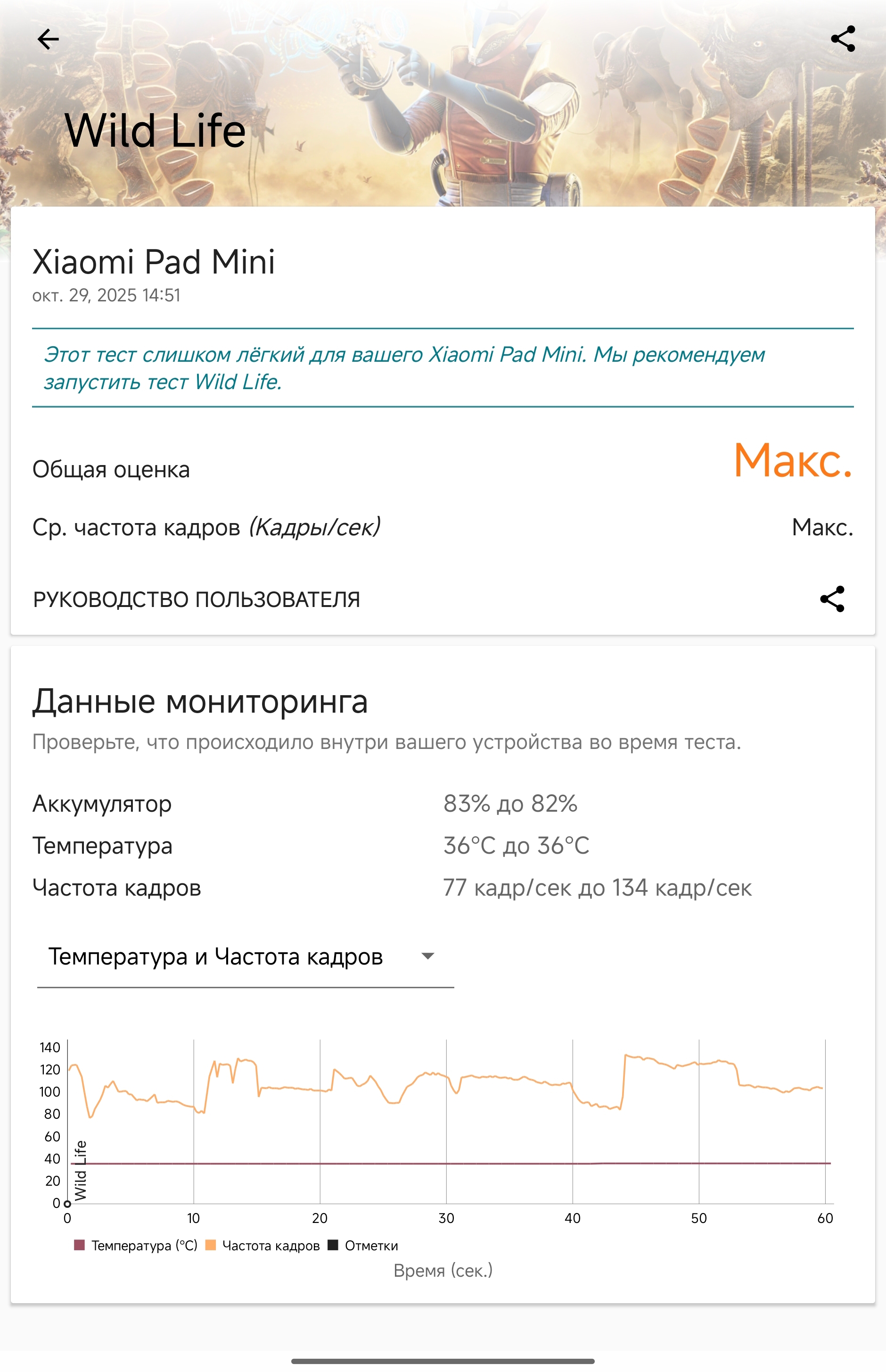 Что важно отметить: во всех играх планшет выдавал стабильный геймплей с максимальным FPS без просадок. При этом нагрев был действительно смешным — даже на максималках в самых требовательных играх температура не превышала 36°C на лицевой стороне и 32°C на задней крышке. Никакого дискомфорта при длительных игровых сессиях. Компактный форм-фактор оказался настоящим преимуществом для игр: держать планшет удобно, руки не устают, все элементы управления находятся в зоне досягаемости. Если брать планшет непосредственно для игр — это эталонное решение. В таком формате играть удобнее, чем на больших таблетках, и можно смело назвать Pad Mini игровым устройством.
