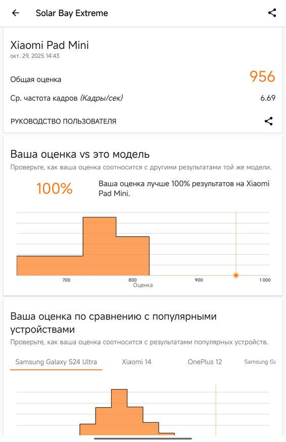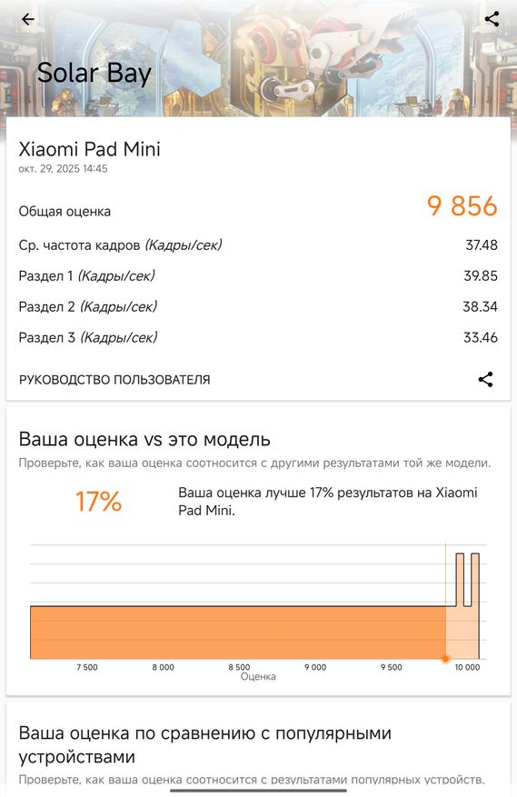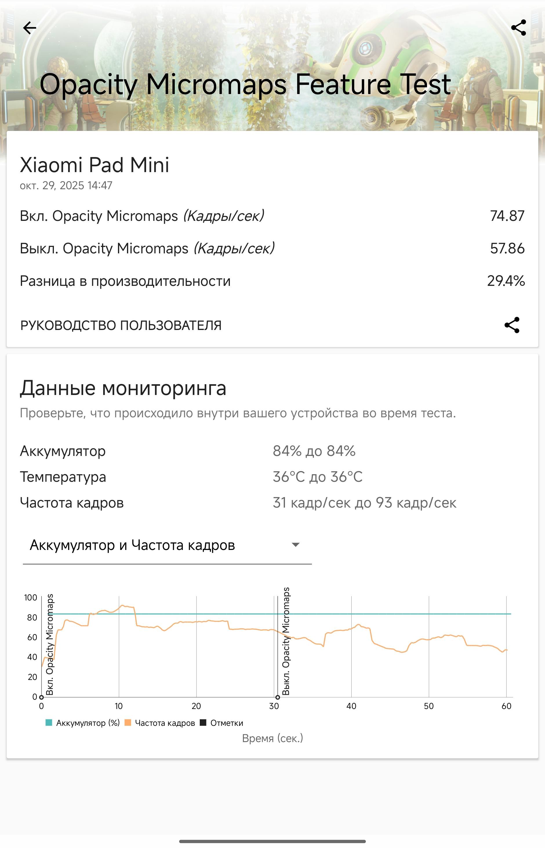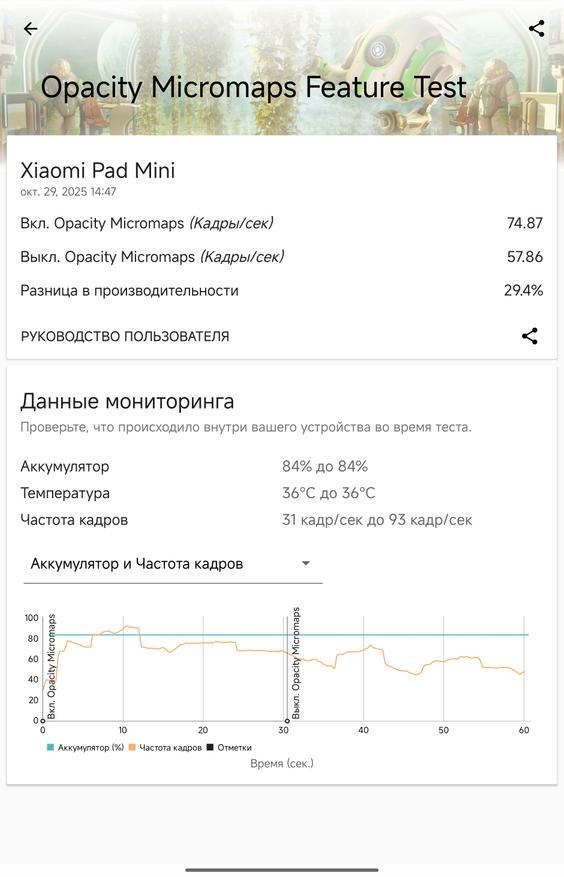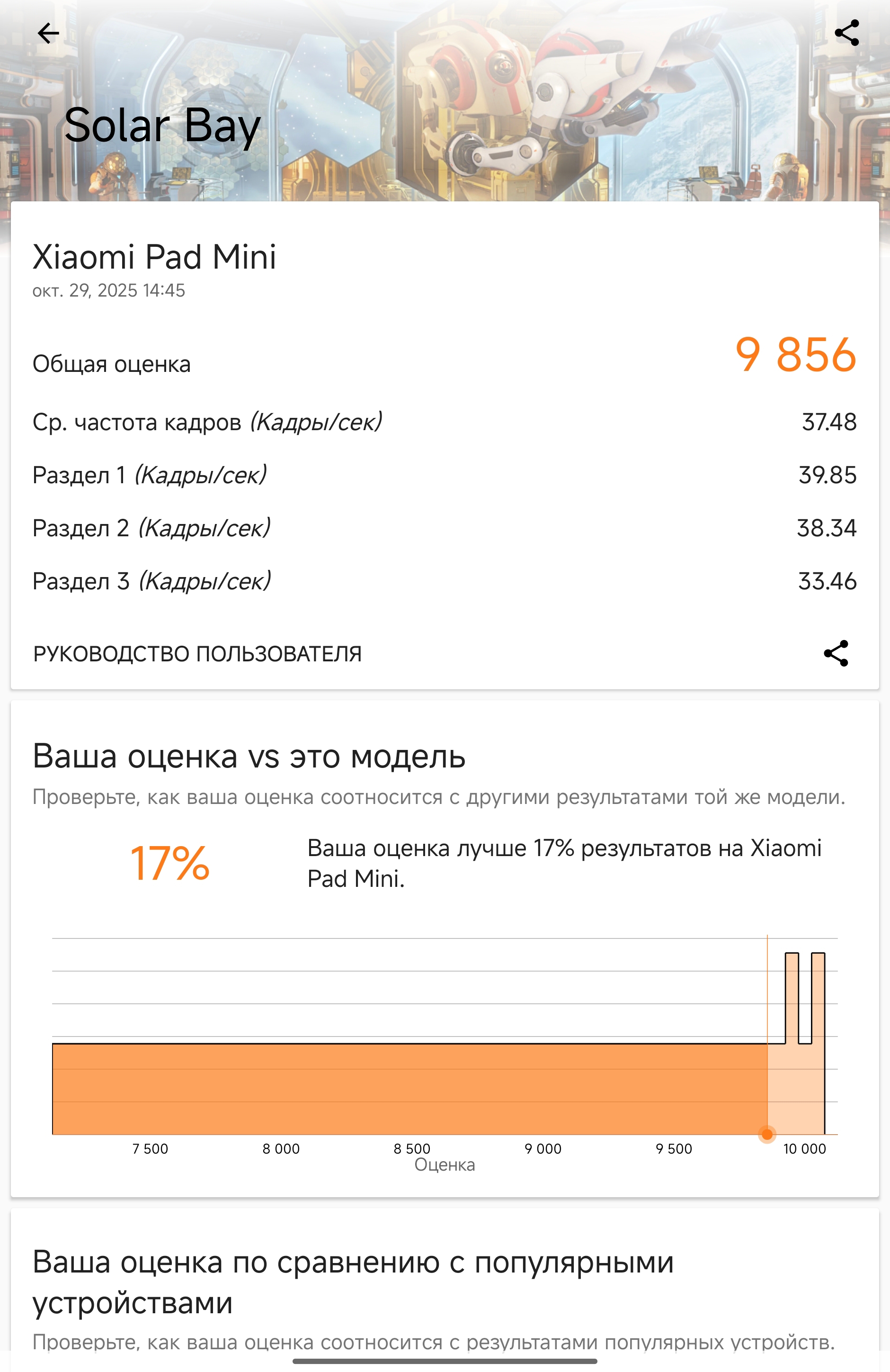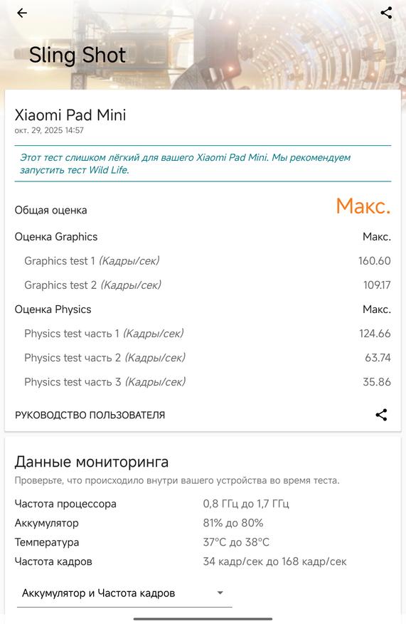 Что важно отметить: во всех играх планшет выдавал стабильный геймплей с максимальным FPS без просадок. При этом нагрев был действительно смешным — даже на максималках в самых требовательных играх температура не превышала 36°C на лицевой стороне и 32°C на задней крышке. Никакого дискомфорта при длительных игровых сессиях. Компактный форм-фактор оказался настоящим преимуществом для игр: держать планшет удобно, руки не устают, все элементы управления находятся в зоне досягаемости. Если брать планшет непосредственно для игр — это эталонное решение. В таком формате играть удобнее, чем на больших таблетках, и можно смело назвать Pad Mini игровым устройством.