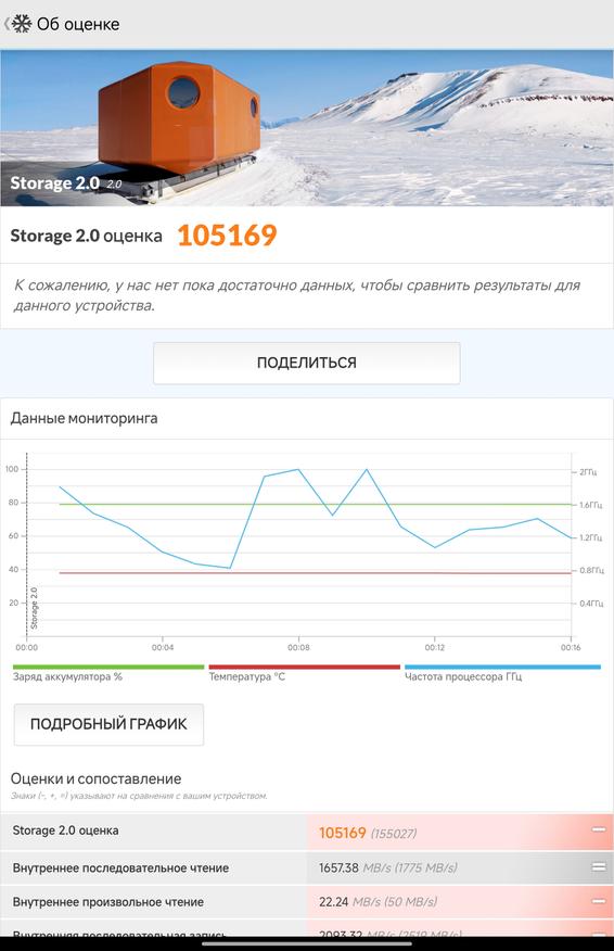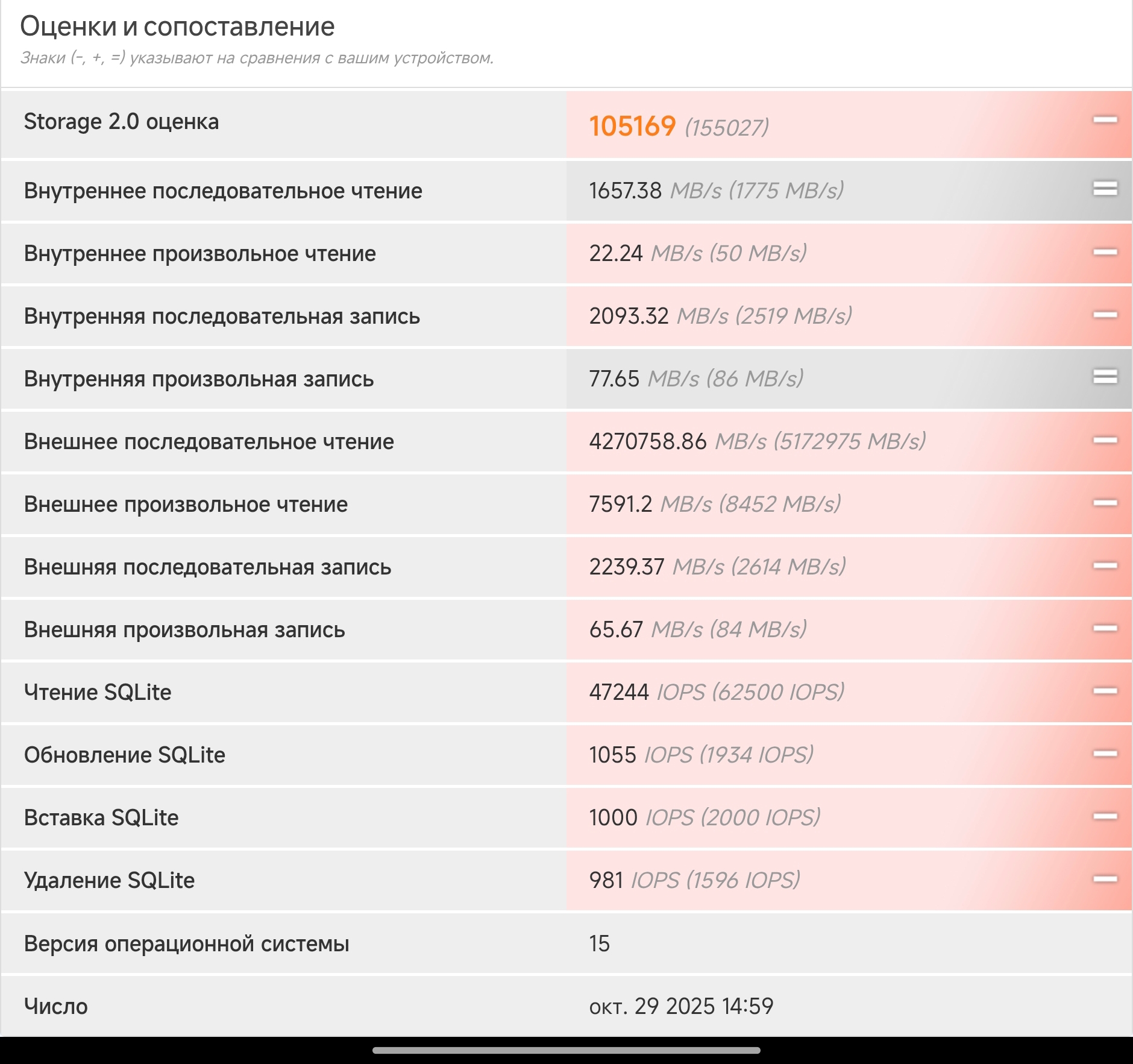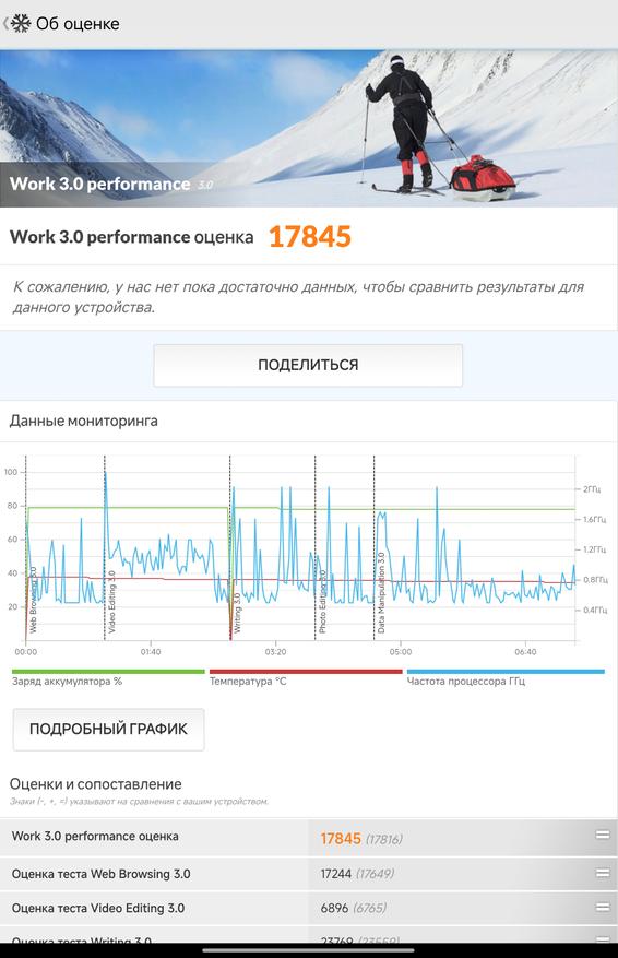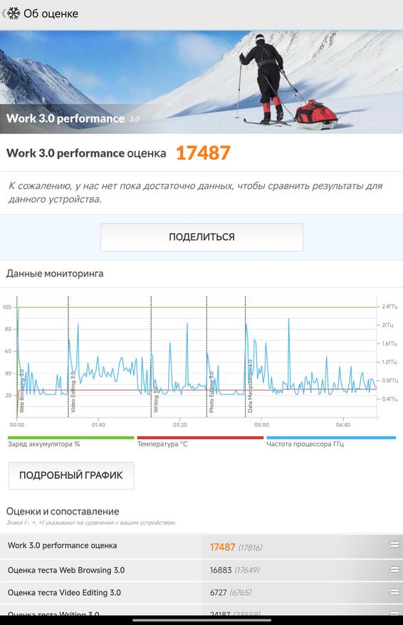 В PCMark Work 3.0 набрал 17487 баллов. Тесты 3DMark тоже впечатлили: Steel Nomad Light — 2168 баллов, Solar Bay Extreme — 956, Solar Bay — 9856, Wild Life Extreme — 5629. В Storage 2.0 планшет выдал 105169 баллов, что говорит о молниеносной скорости работы памяти UFS 4.1.