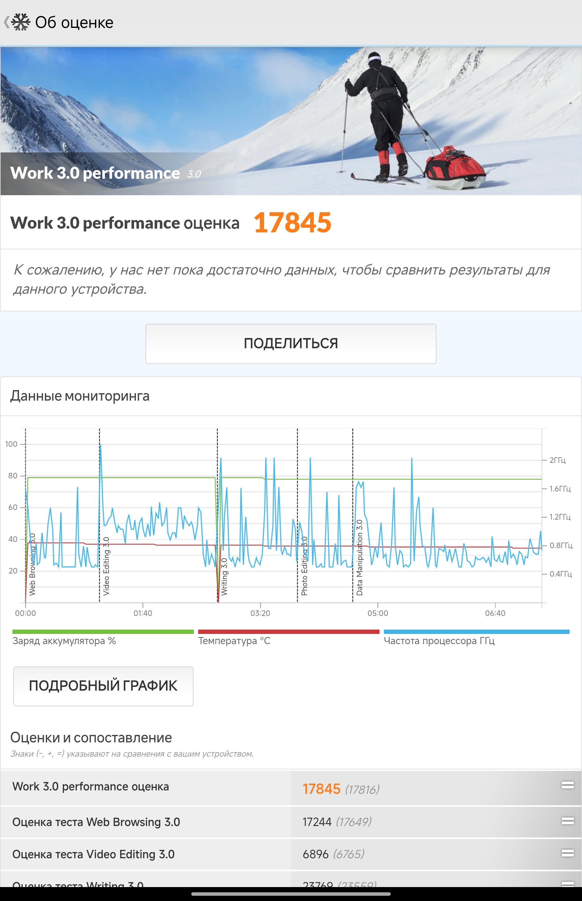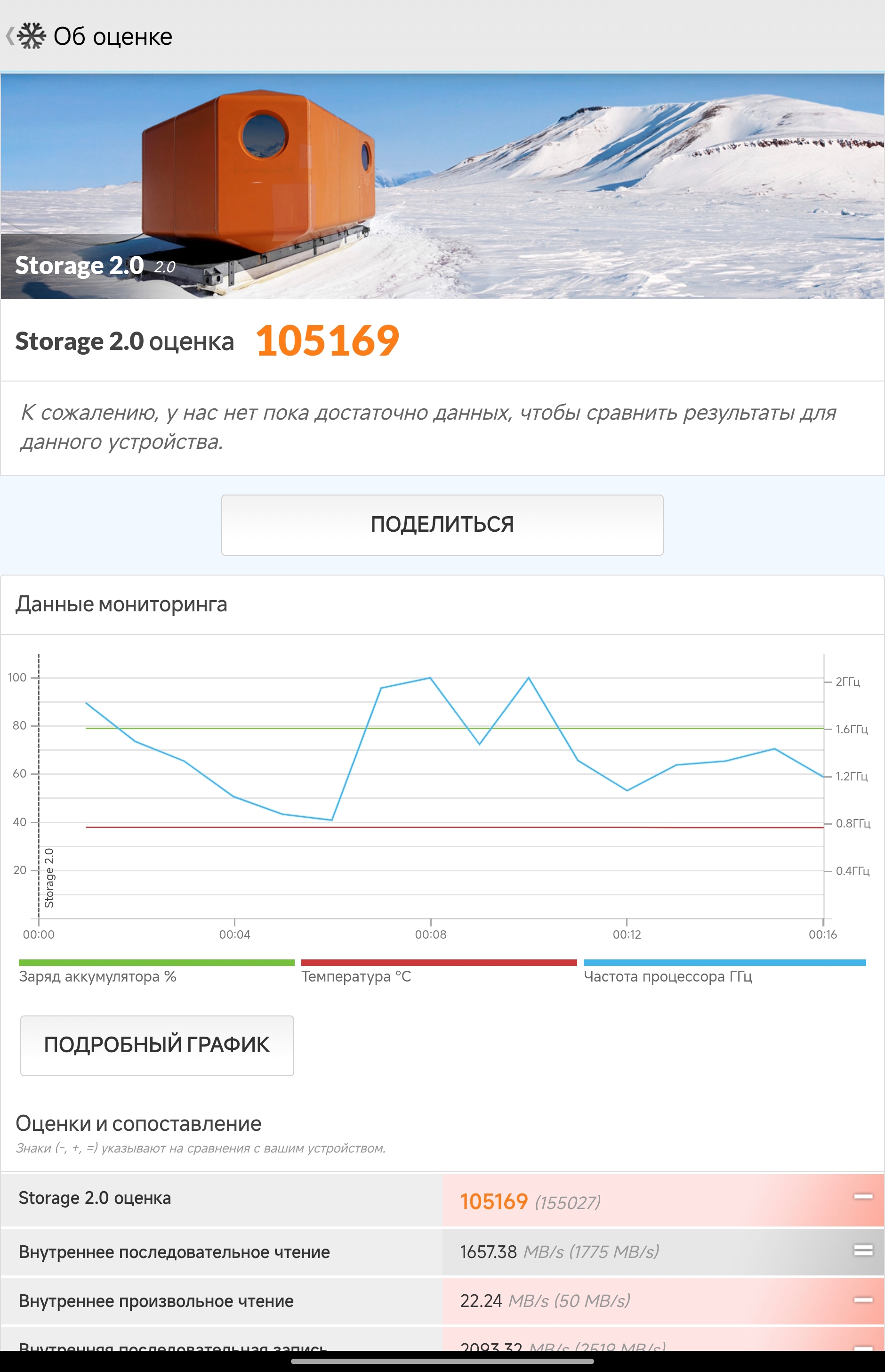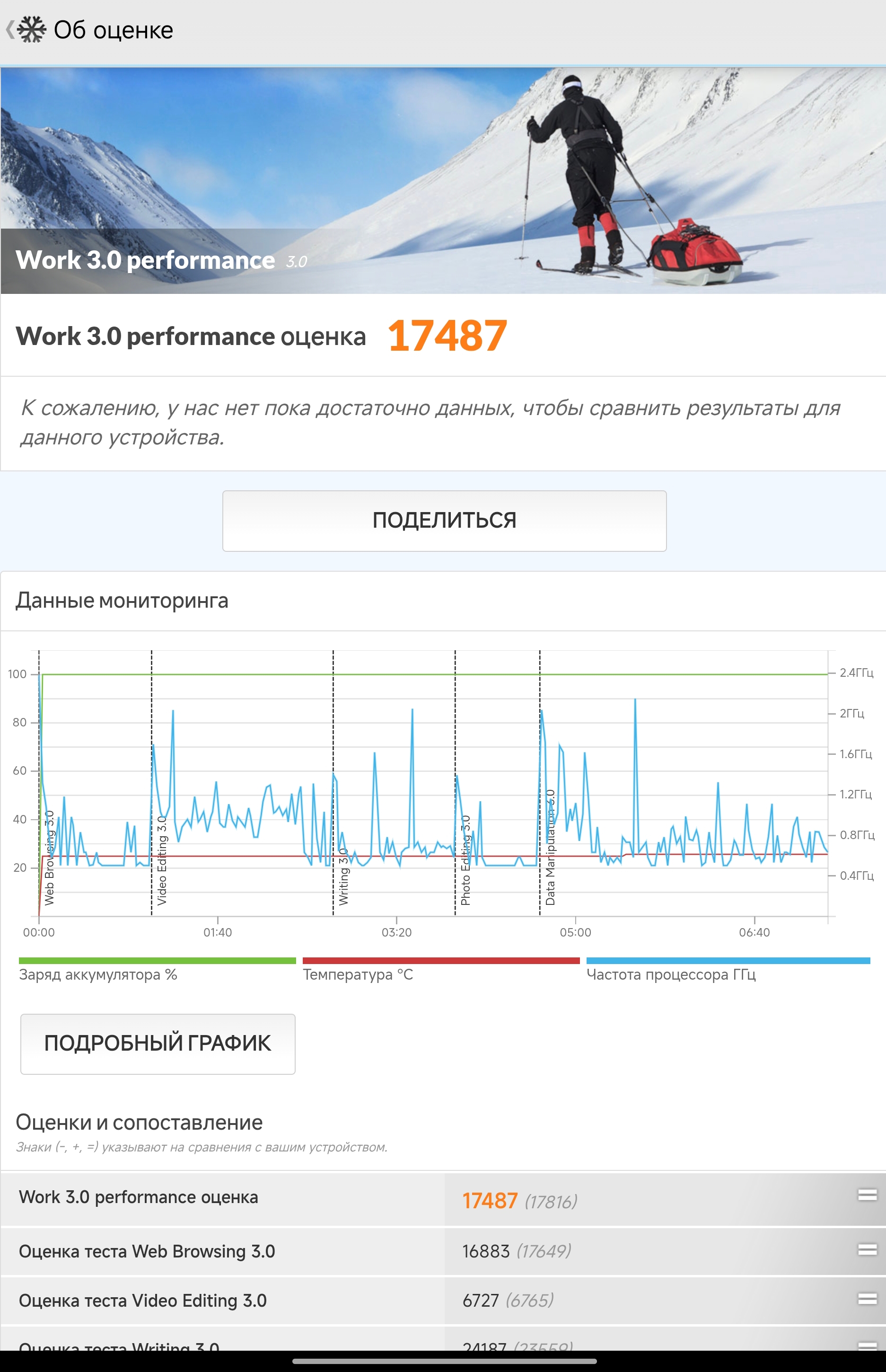 В PCMark Work 3.0 набрал 17487 баллов. Тесты 3DMark тоже впечатлили: Steel Nomad Light — 2168 баллов, Solar Bay Extreme — 956, Solar Bay — 9856, Wild Life Extreme — 5629. В Storage 2.0 планшет выдал 105169 баллов, что говорит о молниеносной скорости работы памяти UFS 4.1.