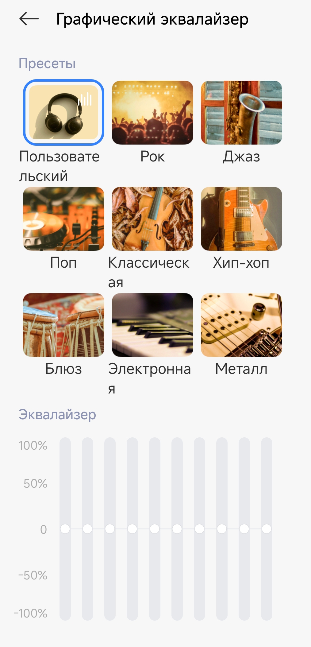 Ещё есть графический эквалайзер с пресетами под разные жанры музыки: Пользовательский (ручная настройка), Рок, Джаз, Поп, Классика, Хип-хоп, Блюз, Электронная, Металл. Каждый пресет реально меняет звучание, а не просто для галочки. Если не нравится ни один — можно настроить вручную, подкрутив частоты под свой вкус.